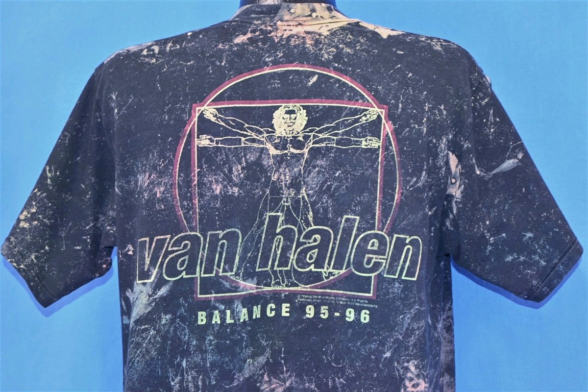 This awesome acid washed concert tee has double-sided graphics that commemorate Van Halen's Balance Tour, which ran from 1995 to 1996. The tour was launched to promote their tenth studio album of the same name. This was the final album released by the group with Sammy Hagar on lead vocals. Hagar was asked to step in to replace founding vocalist, David Lee Roth, who departed the band to pursue a solo career in 1985. Hagar helped the band to produce four chart-topping platinum albums, including Balance in 1995. Some popular singles off the album included "Don't Tell Me (What Love Can Do)", "Can't Stop Loving You", and "Amsterdam".