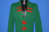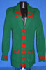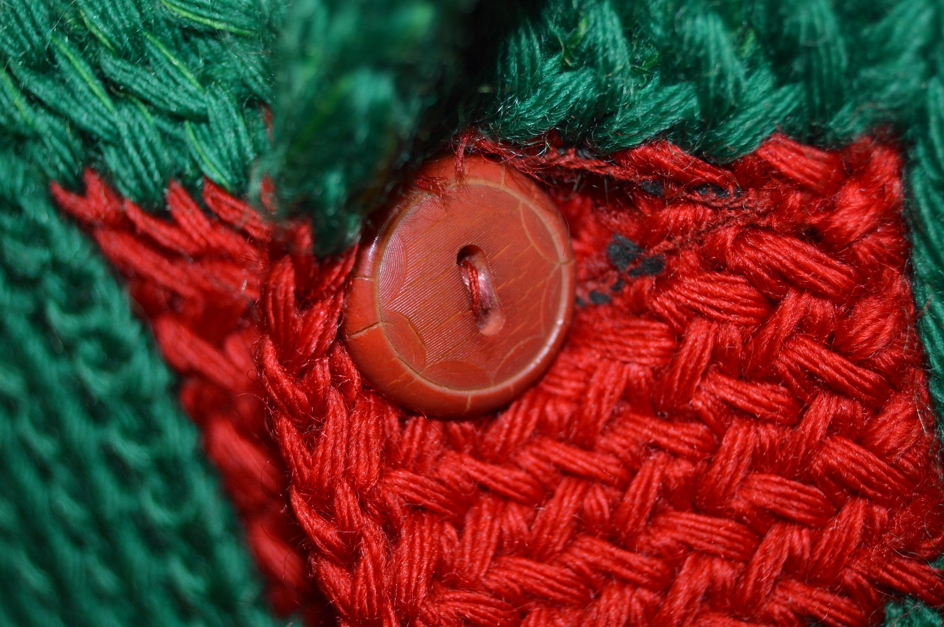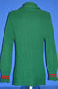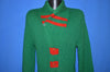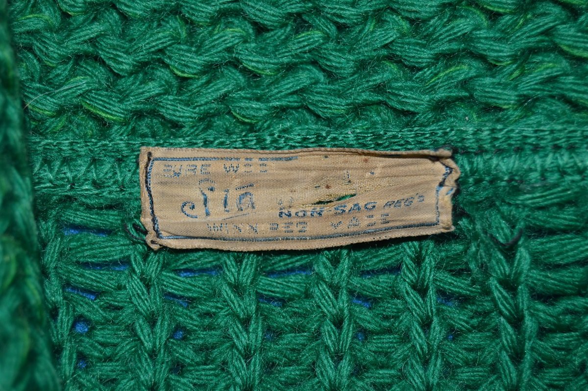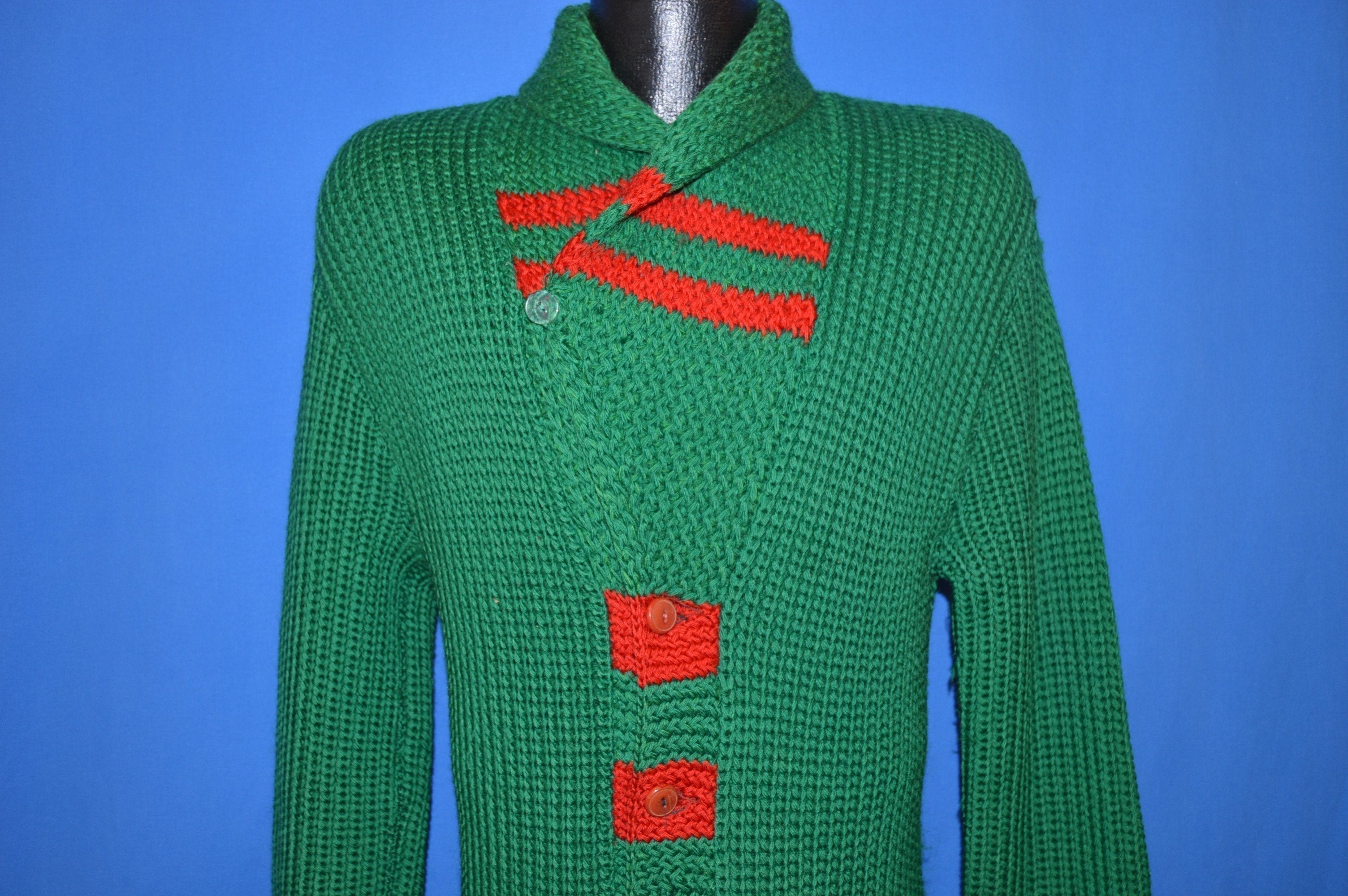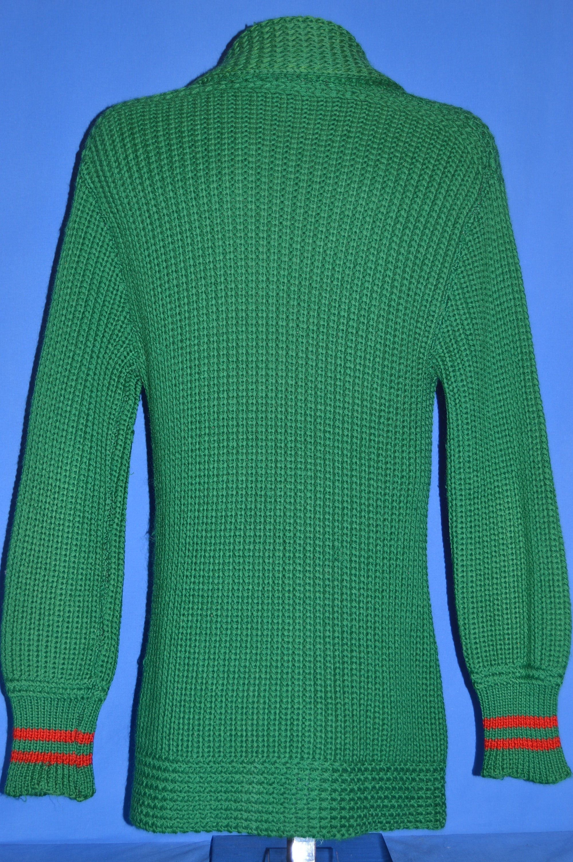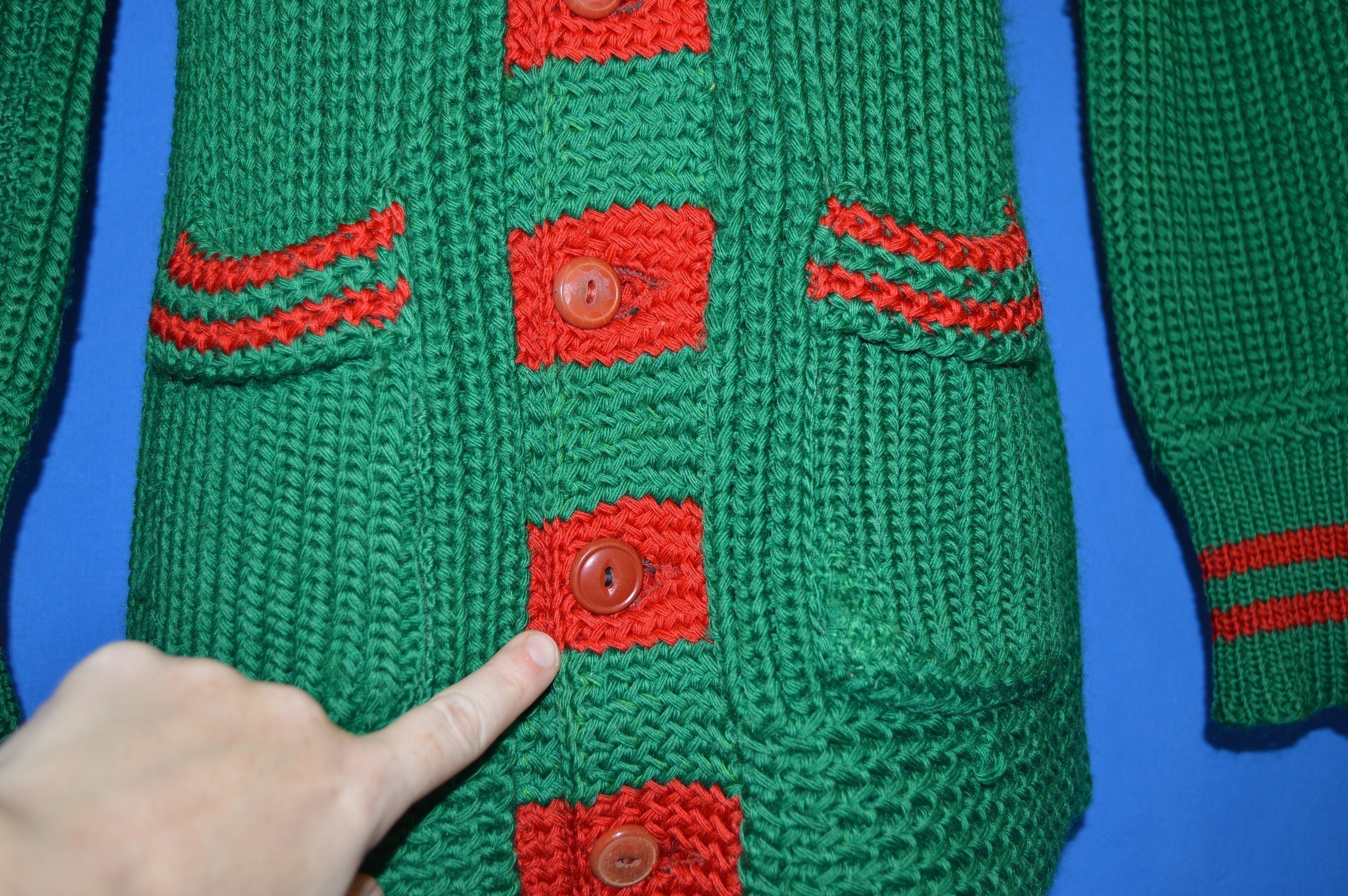 This amazing long green cardigan is from the 30s and is in excellent condition. It has red stripes across the collar and down the middle and around the sleeves. It has a button over shawl cover with original bakelite buttons lining down the center. It also has two hand pockets on the bottom of the sweater.