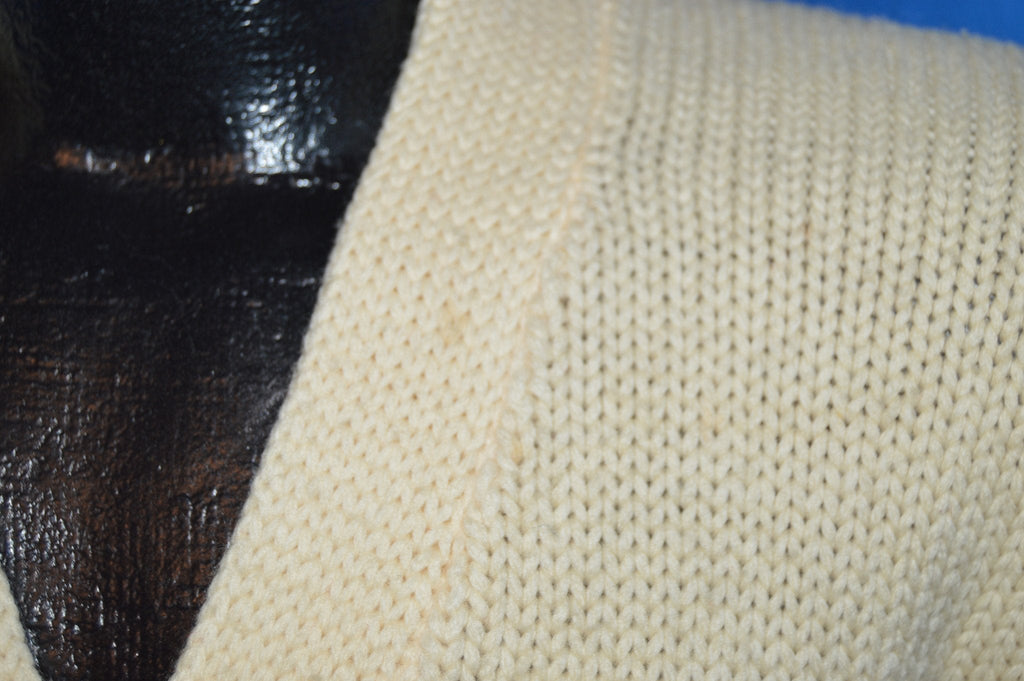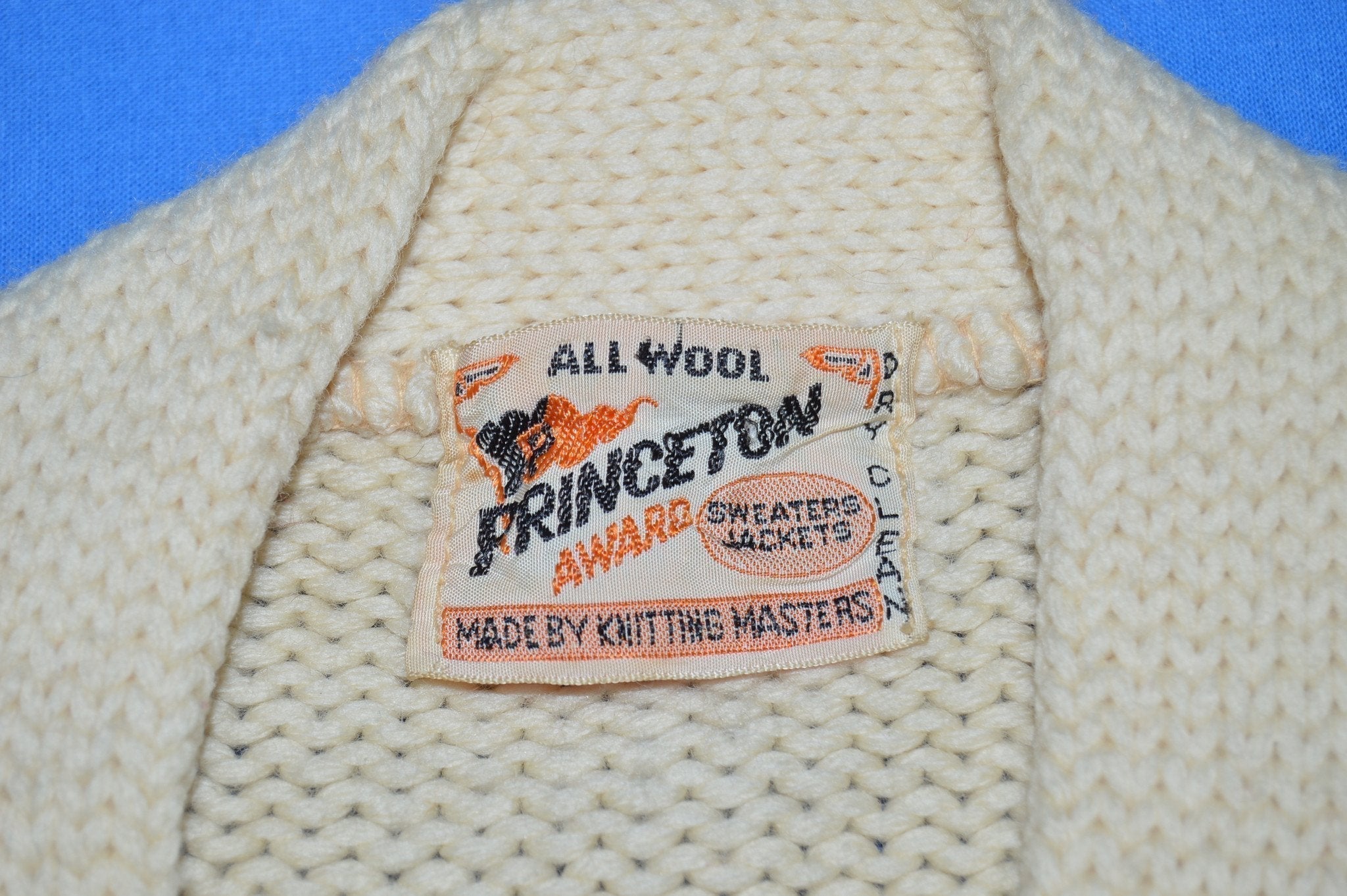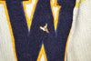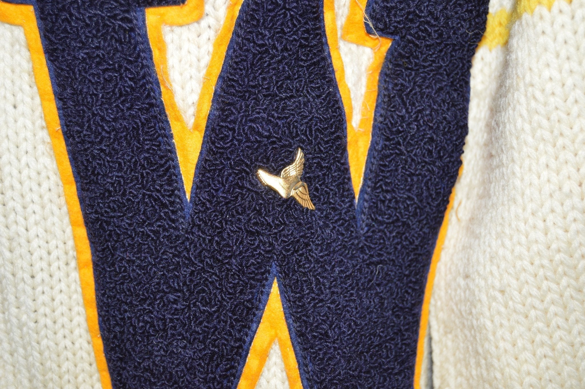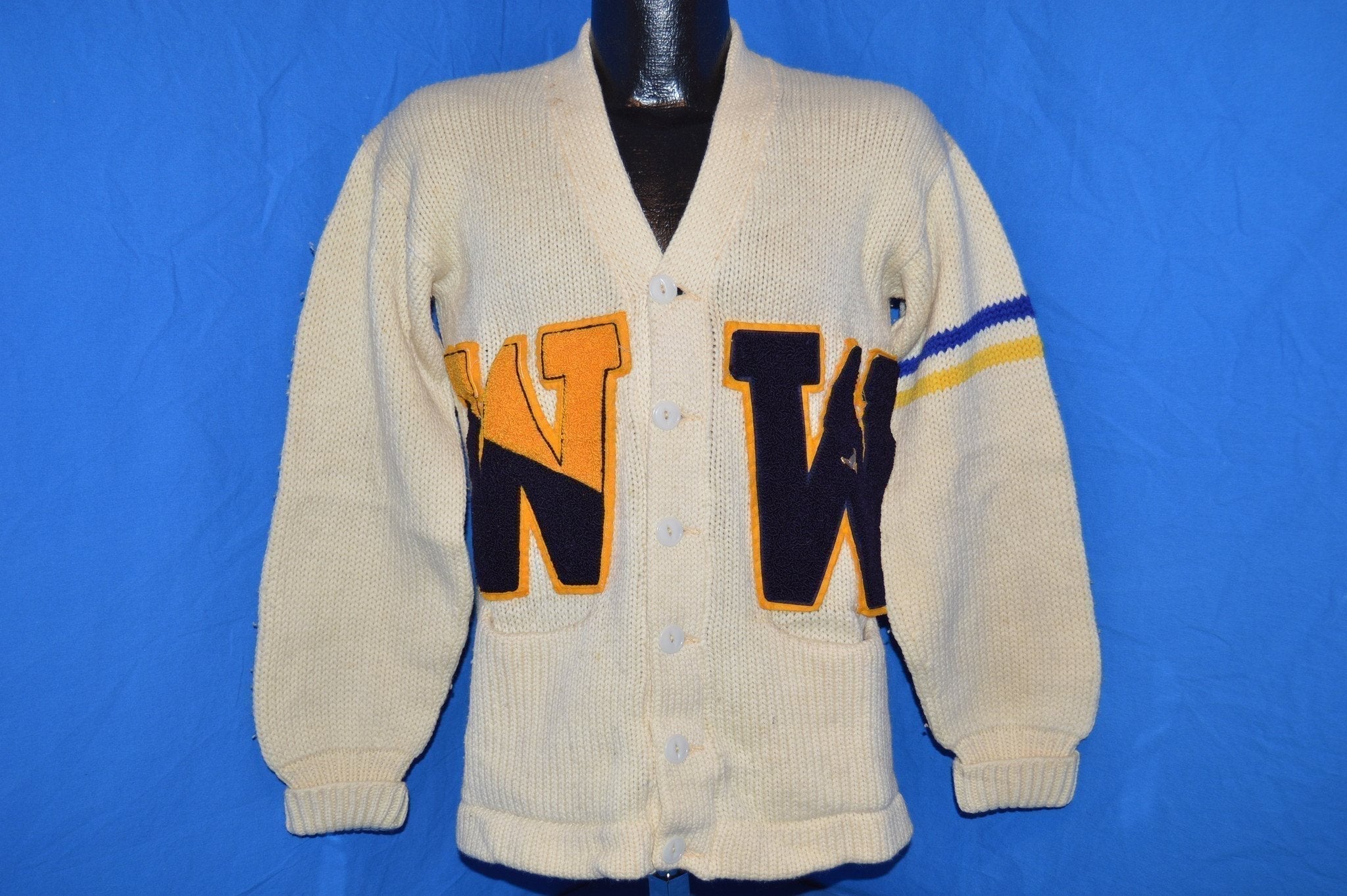 Beautiful letterman sweater from the 40s features blue and yellow stripes on the left sleeve and a W applique on each side of the front, one of which has a winged shoe pin. There are several light spots on the sweater but no sign of moth holes or other damage. See pics
