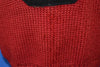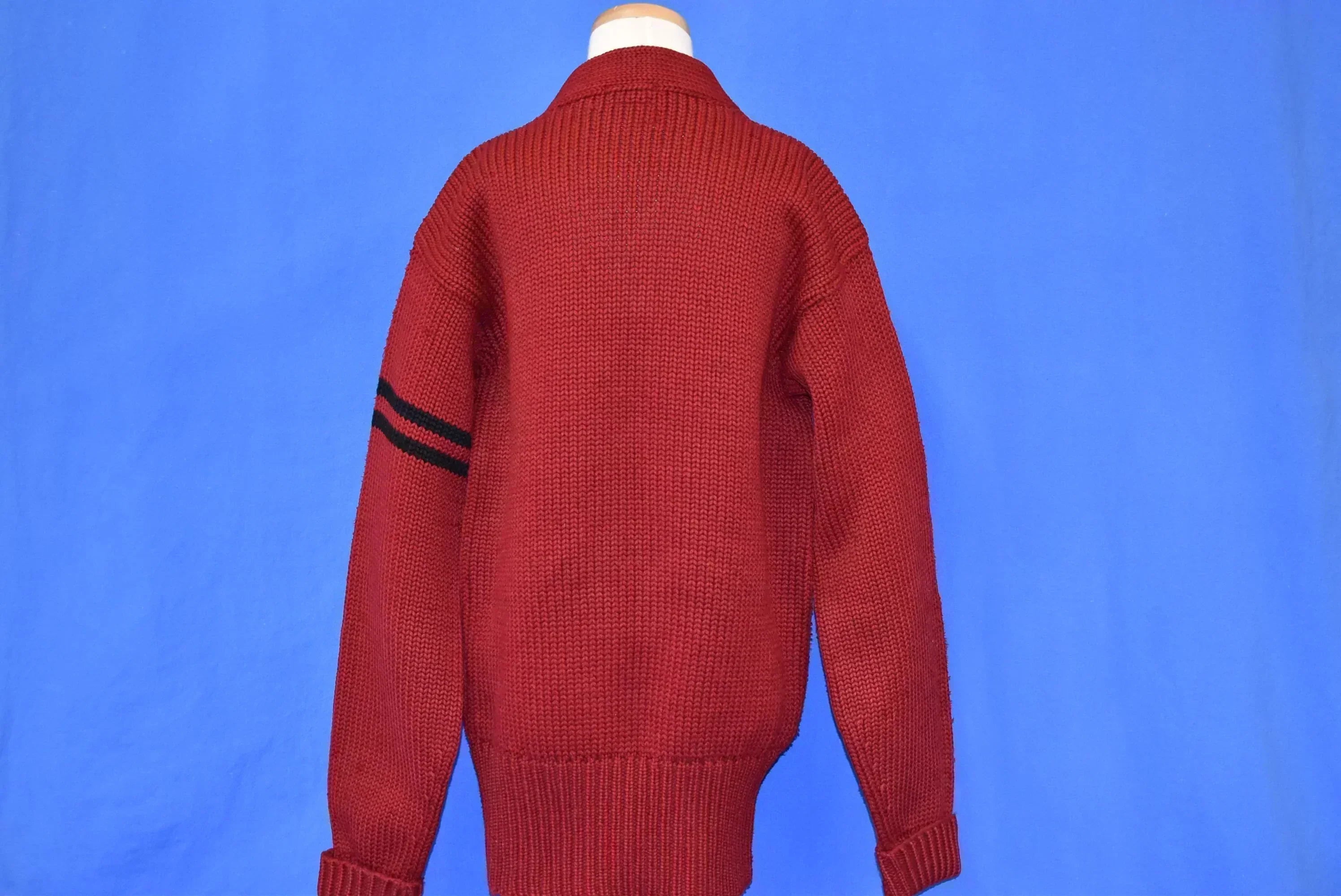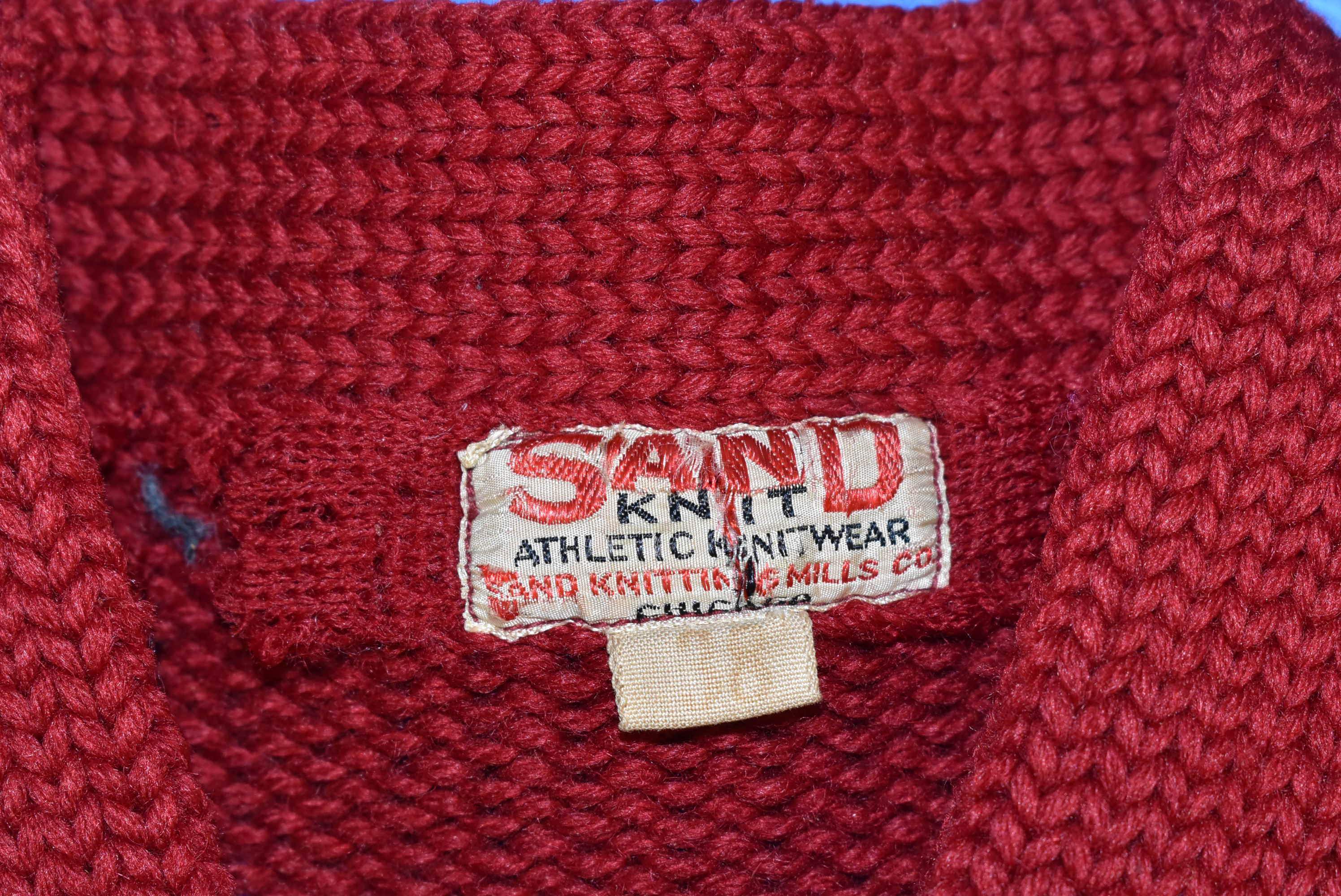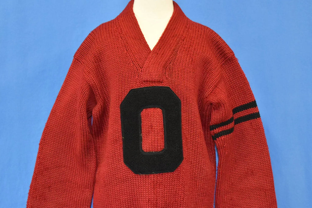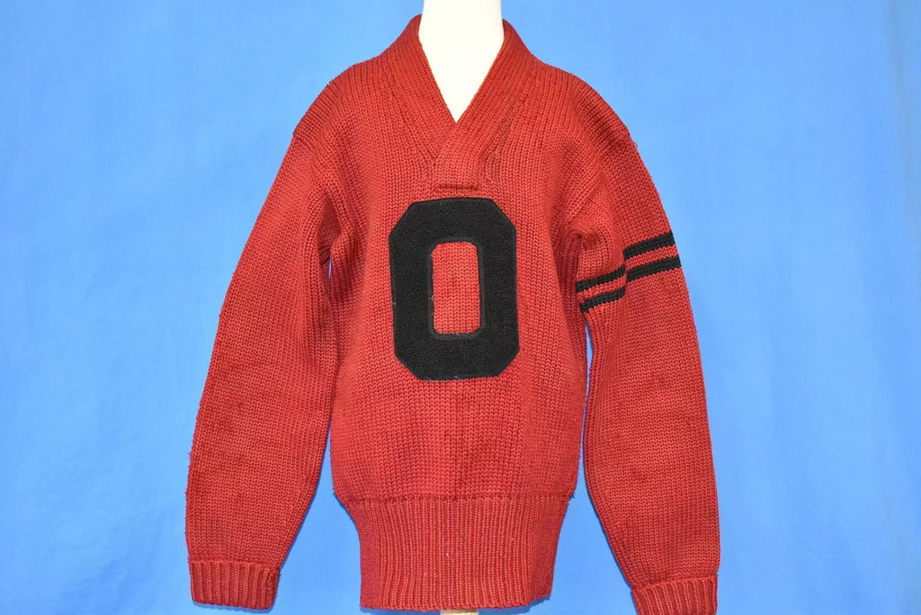 This v-neck letterman sweater is from the 1940s!  It is red with black stripes on the left sleeve and a large "O" applique on the front.  The sweater is very old and some of the yarn is partially unraveled, though there are not any explicit holes that we can find.