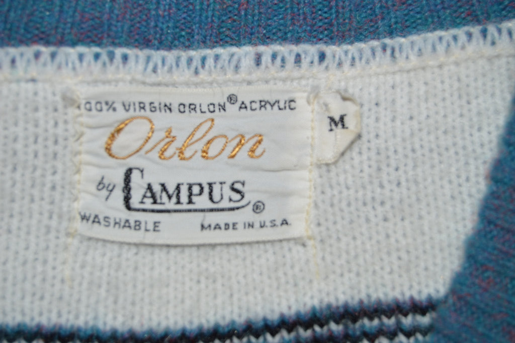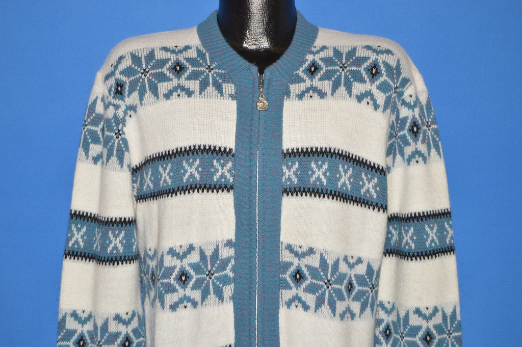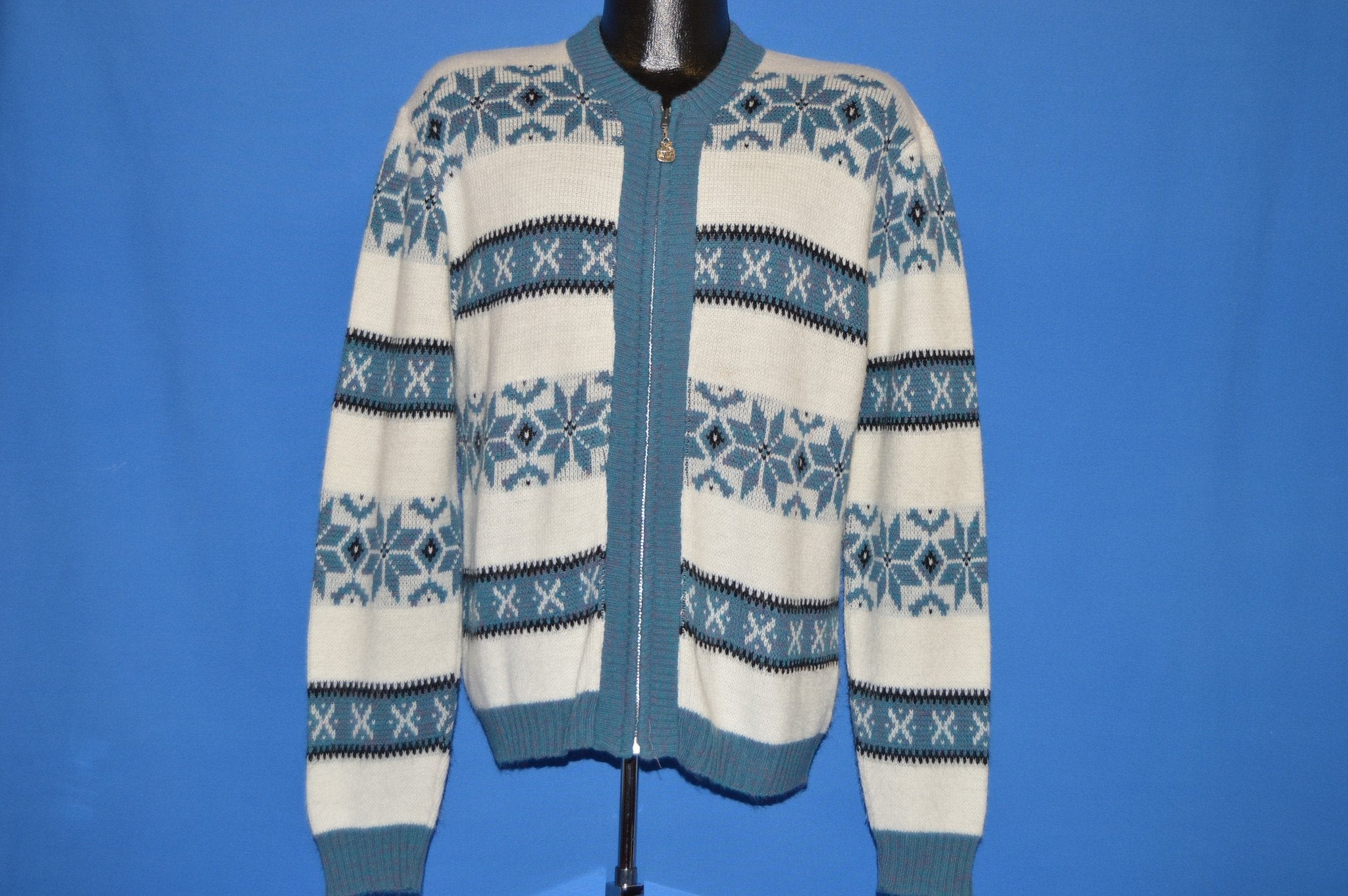 This vintage sweater is white with blue stripes of snowflakes. The cardigan sweater has a zip up front and is an acrylic knit.