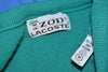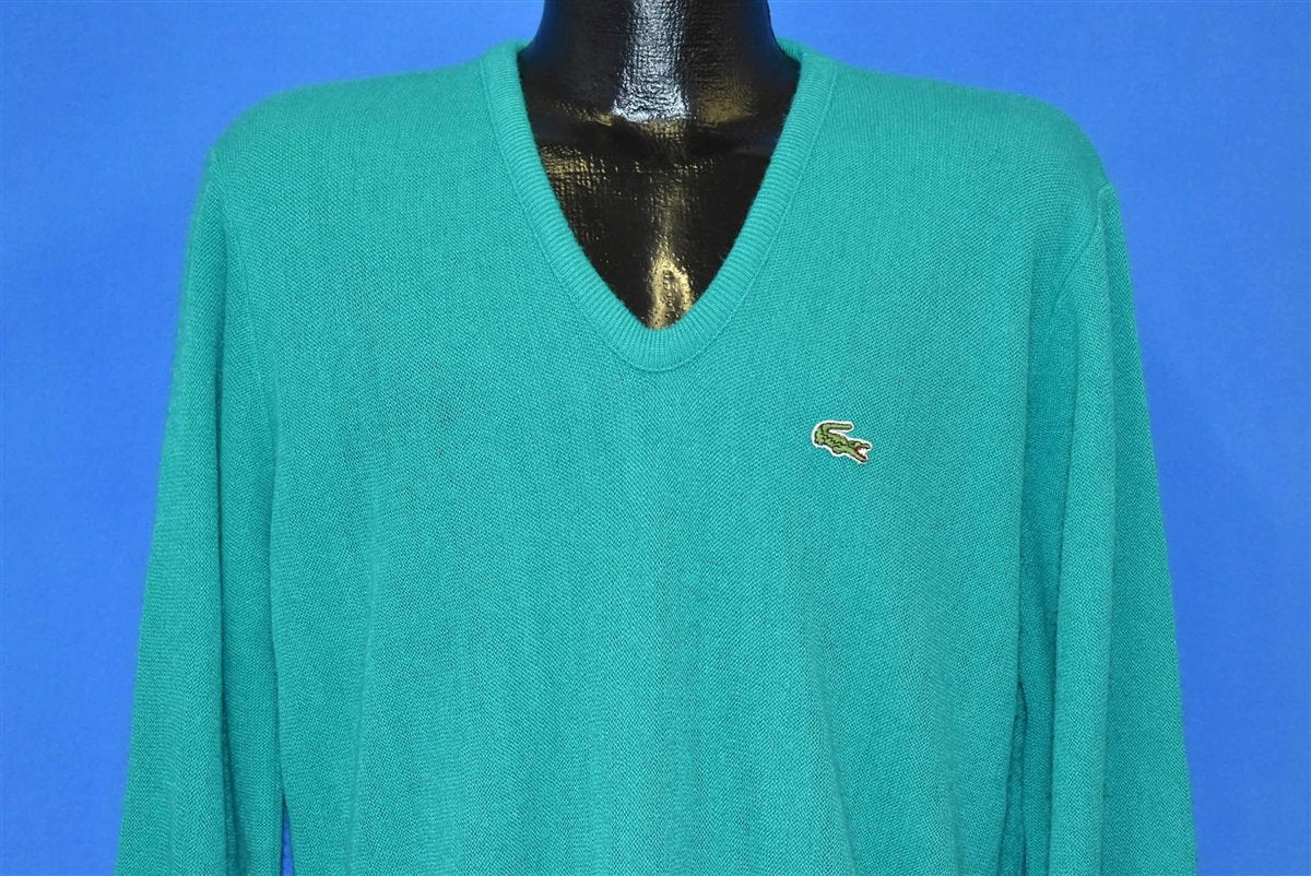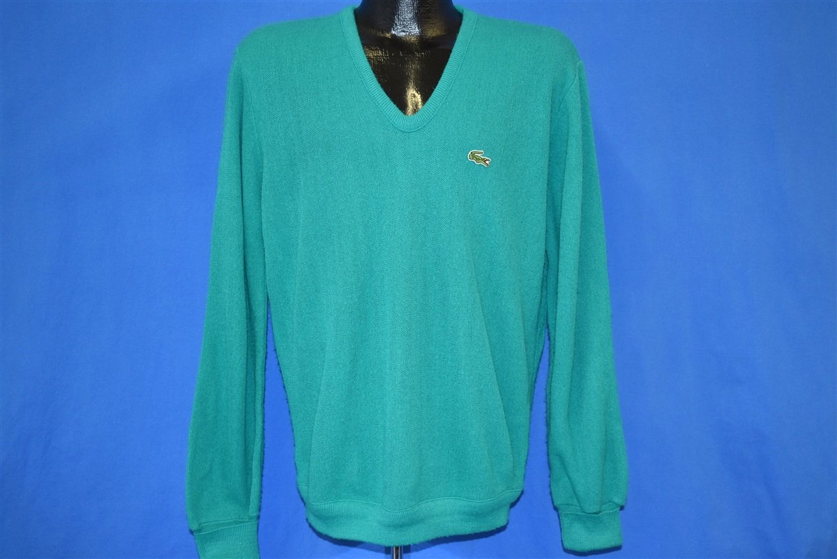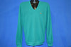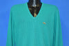 This teal green Izod Lacoste pullover sweater is from the 1970s! The sweater has the classic crocodile patch appliqued on the chest, with roll-up sleeves cuffs and a baggy fit.