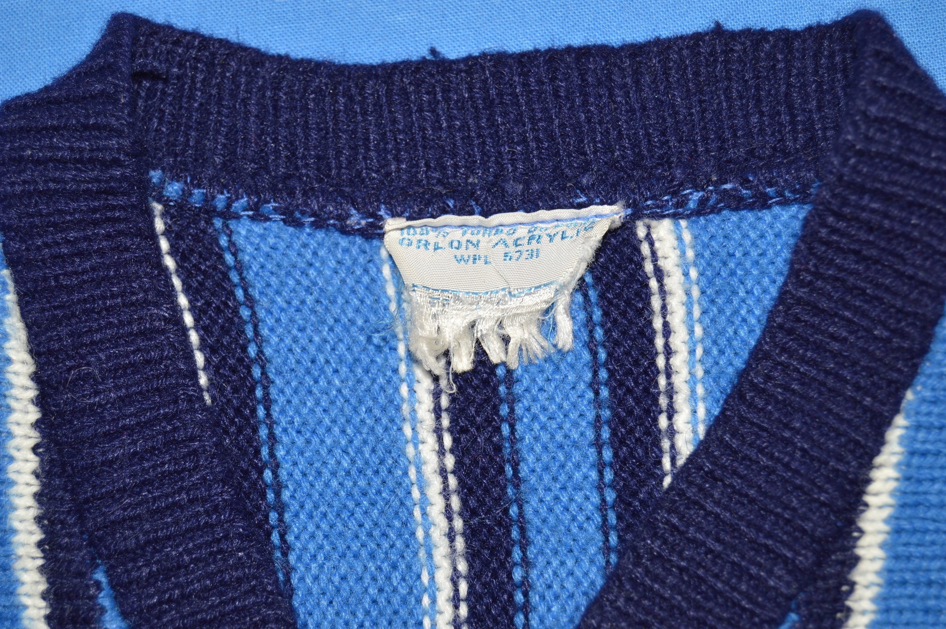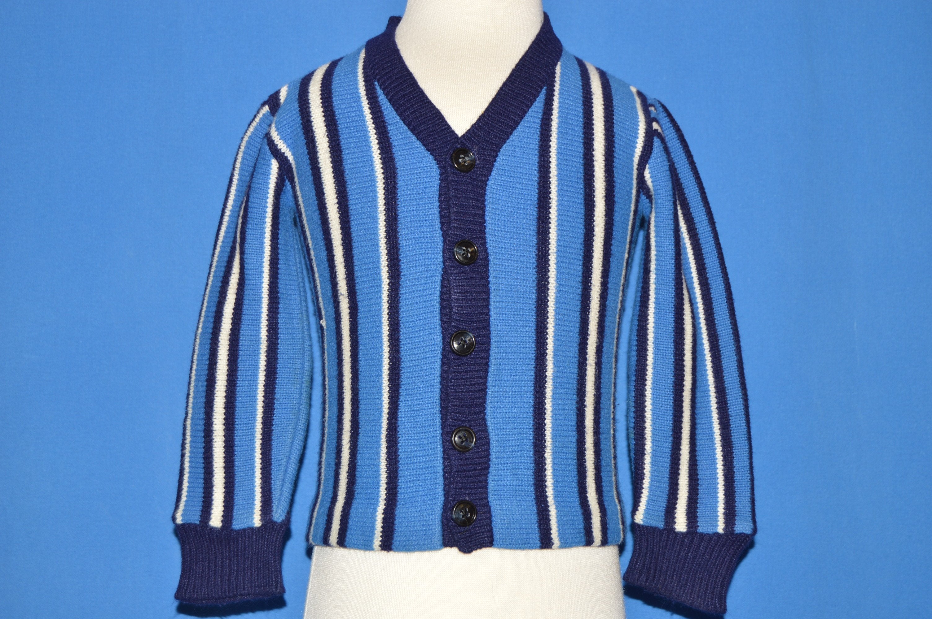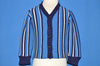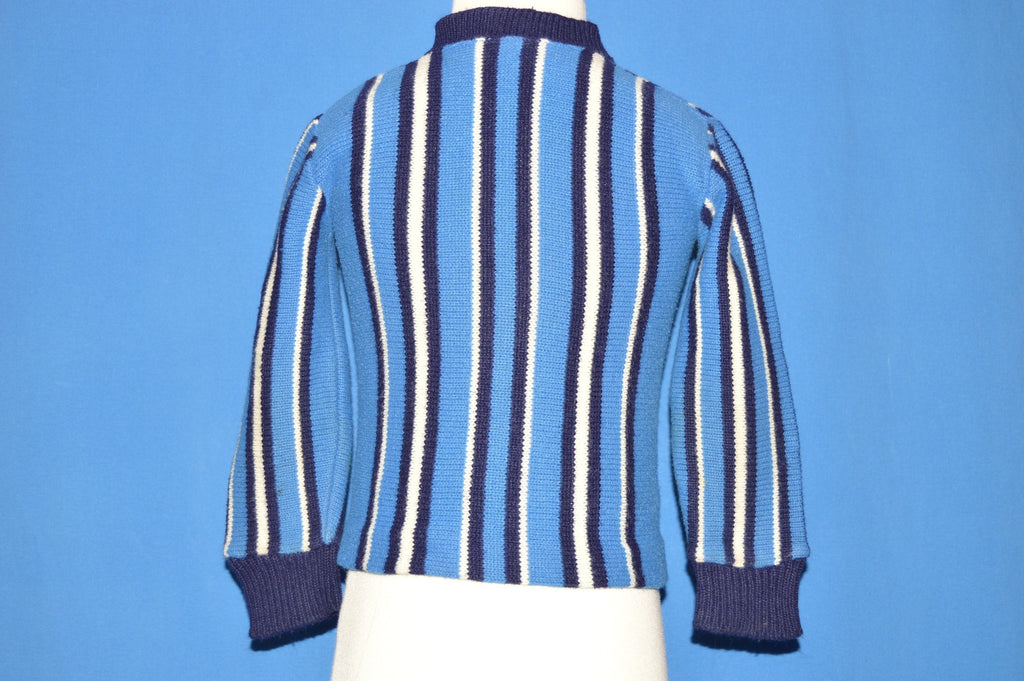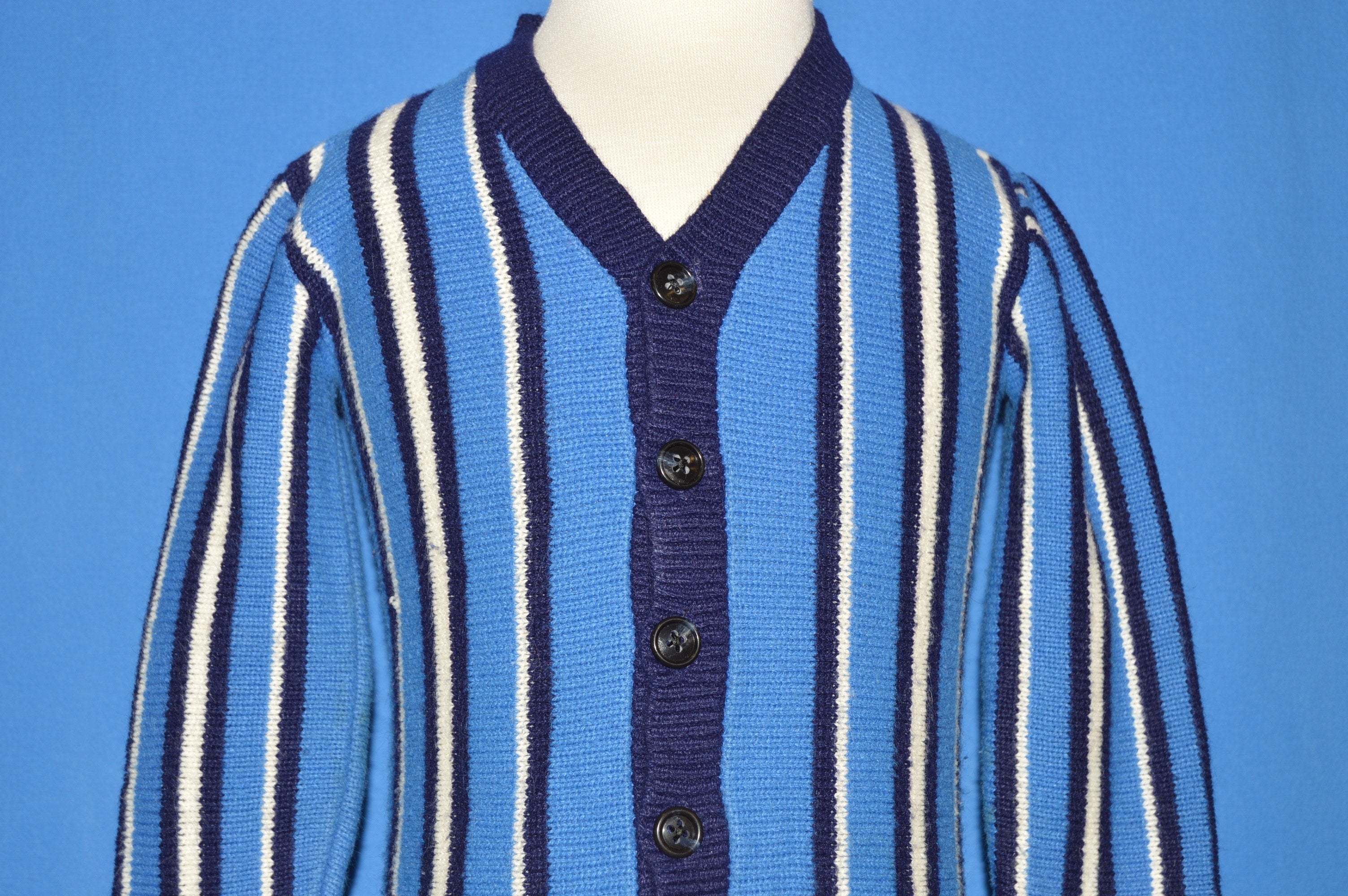 This striped acrylic cardigan sweater is from the 70s and is in excellent condition. There are five-button closure down the middle and features a white and blue striped pattern throughout the sweater.