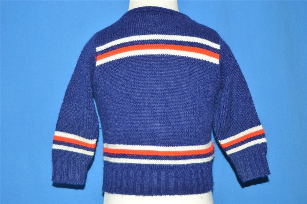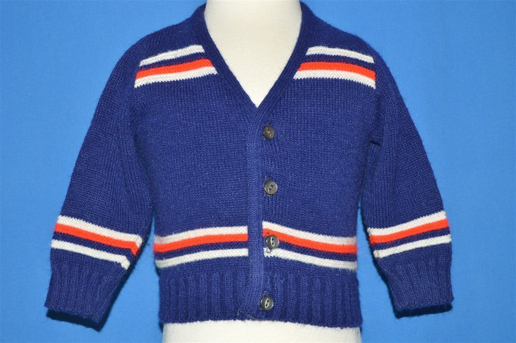 This baby cardigan sweater is from the 1970s. The sweater features four button closures down the front and features red, white and blue horizontal stripes throughout.