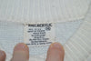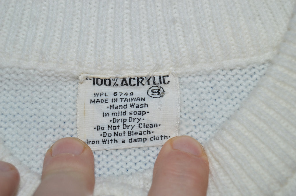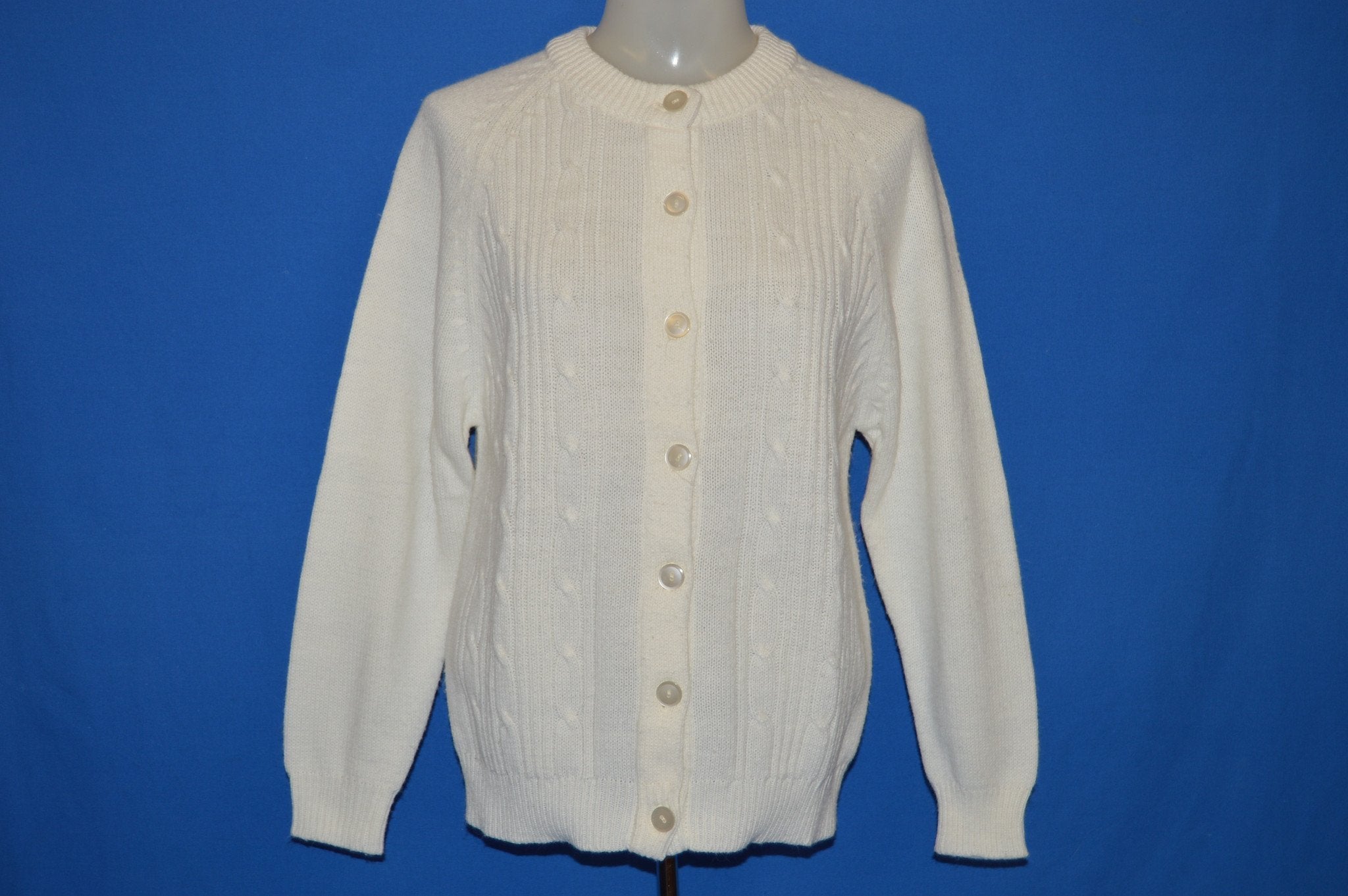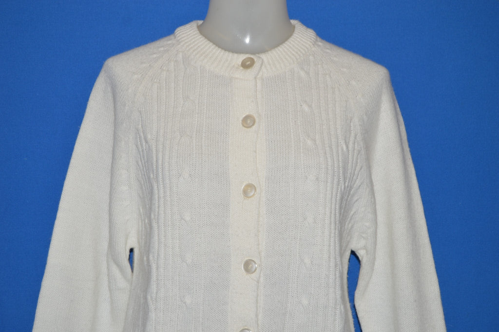 This vintage cardigan sweater has a button up front. The material is a cable knit white acrylic.