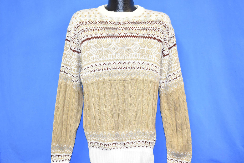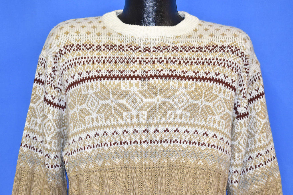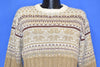 This vintage sweater is super cozy and low-maintenance. It's made from 100% acrylic and has beautifully intricate designs of snowflakes, zigzag, and diamonds carefully crafted in the fabric.