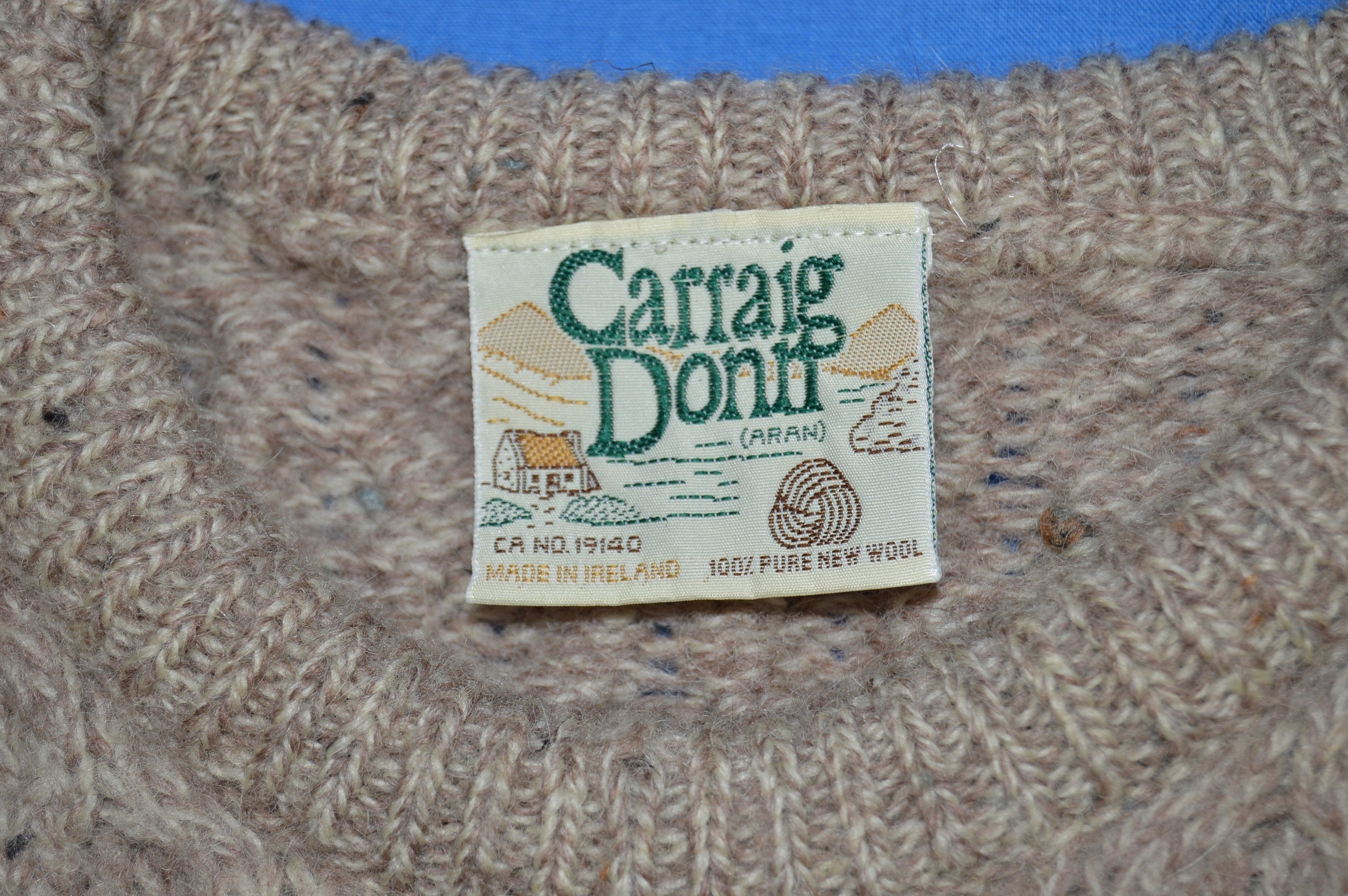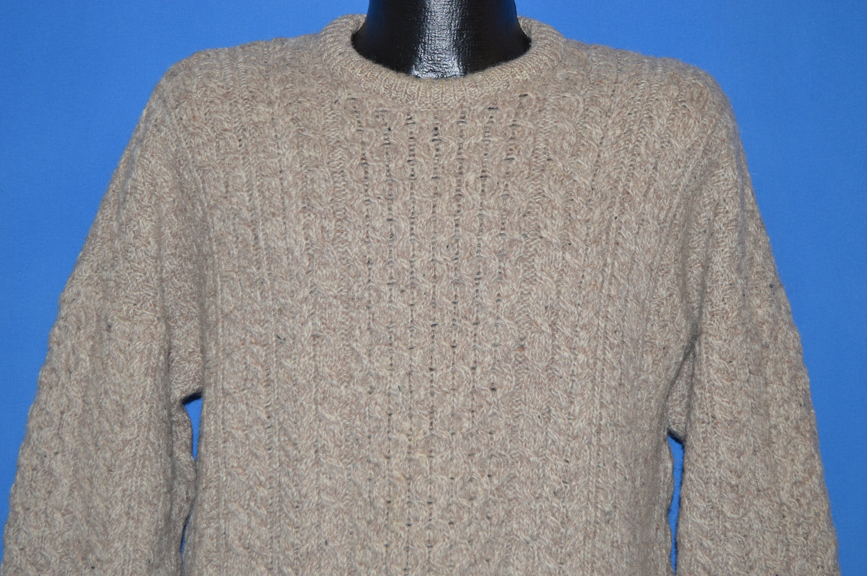 This chunky beige Aran cable knit sweater was made by Carraig Donn in Ireland in the 1980s. It was knit with 100% pure new wool.