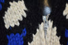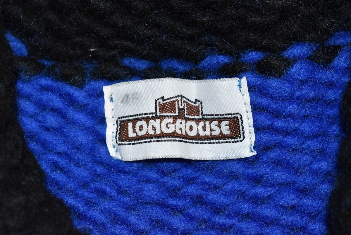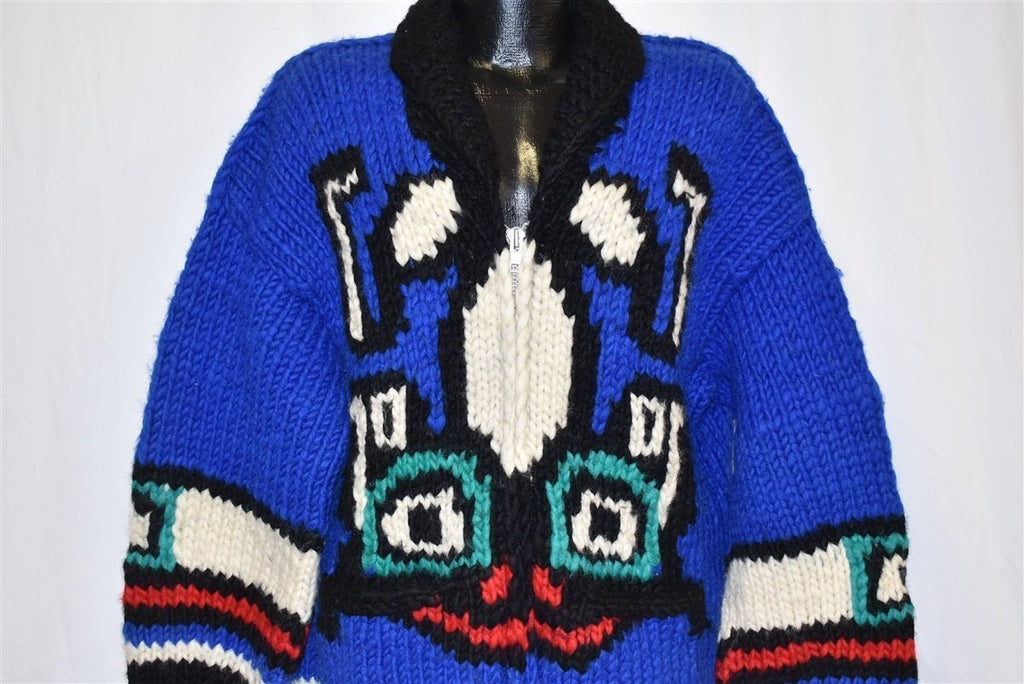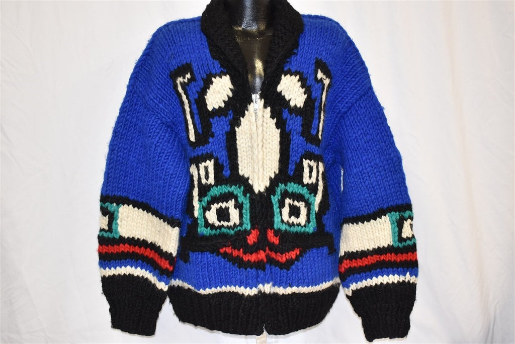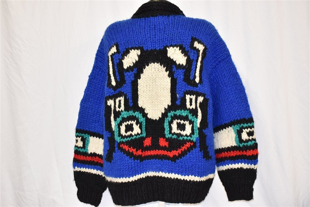 This vintage sweater was made in the 80s in a cowichan style inspired by the Cowichan people of Vancouver Island in Canada. Most traditional cowichan sweaters use natural wool colors but this one comes in a bright vibrant blue and it has a bold pattern featuring a smiling frog on the front and the back. In Native American art frogs are used on totem poles to symbolize stability. They can also represent wealth, abundance, and good luck. This sweater is made of a thick heavy wool that will keep you cozy and warm against cold weather. It also has a metal zipper closure and shawl neck collar.
