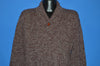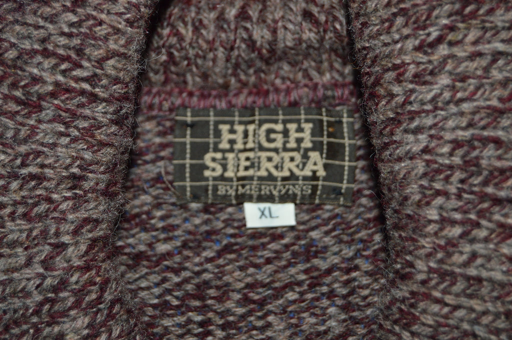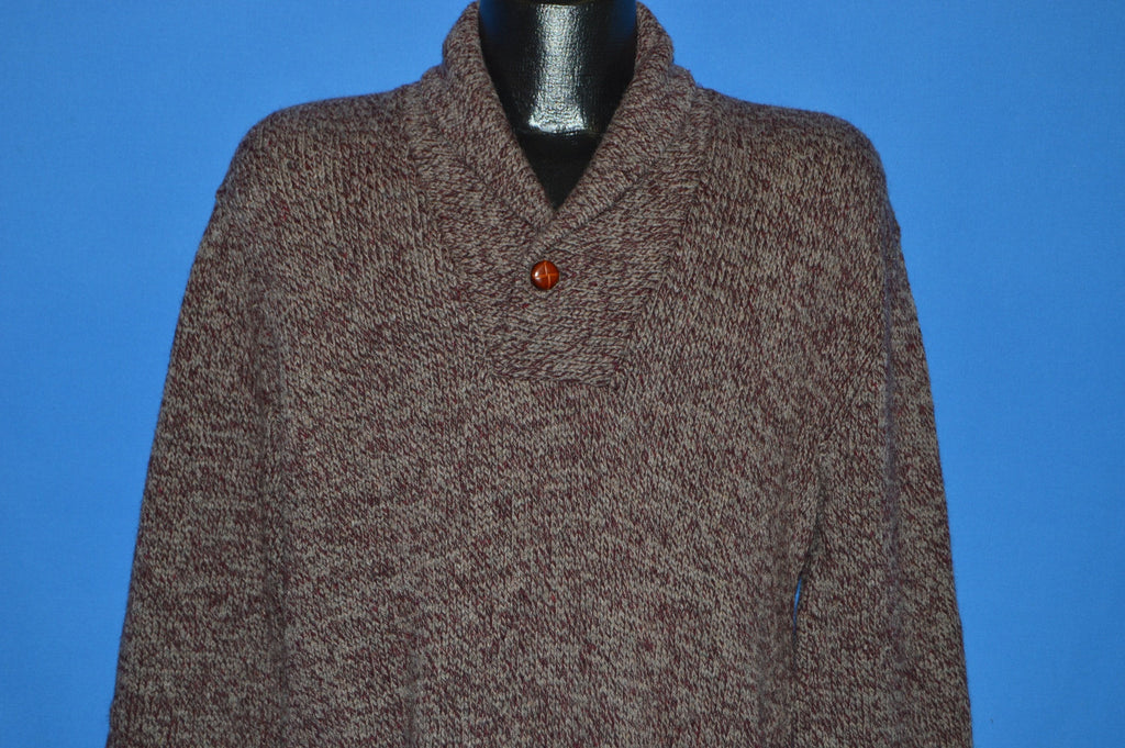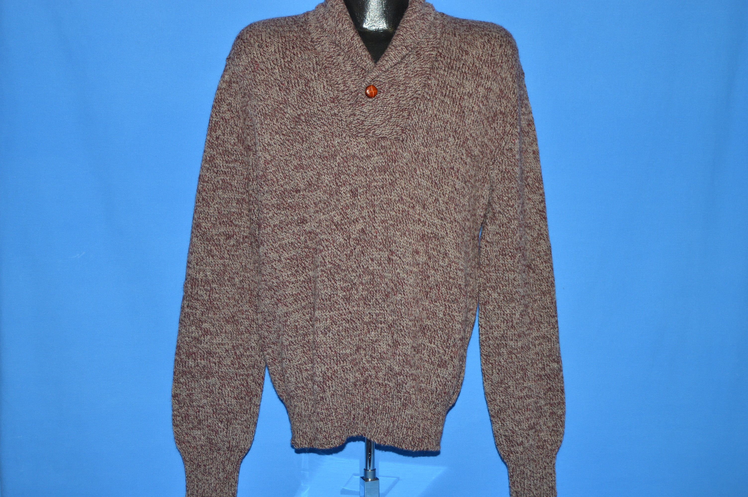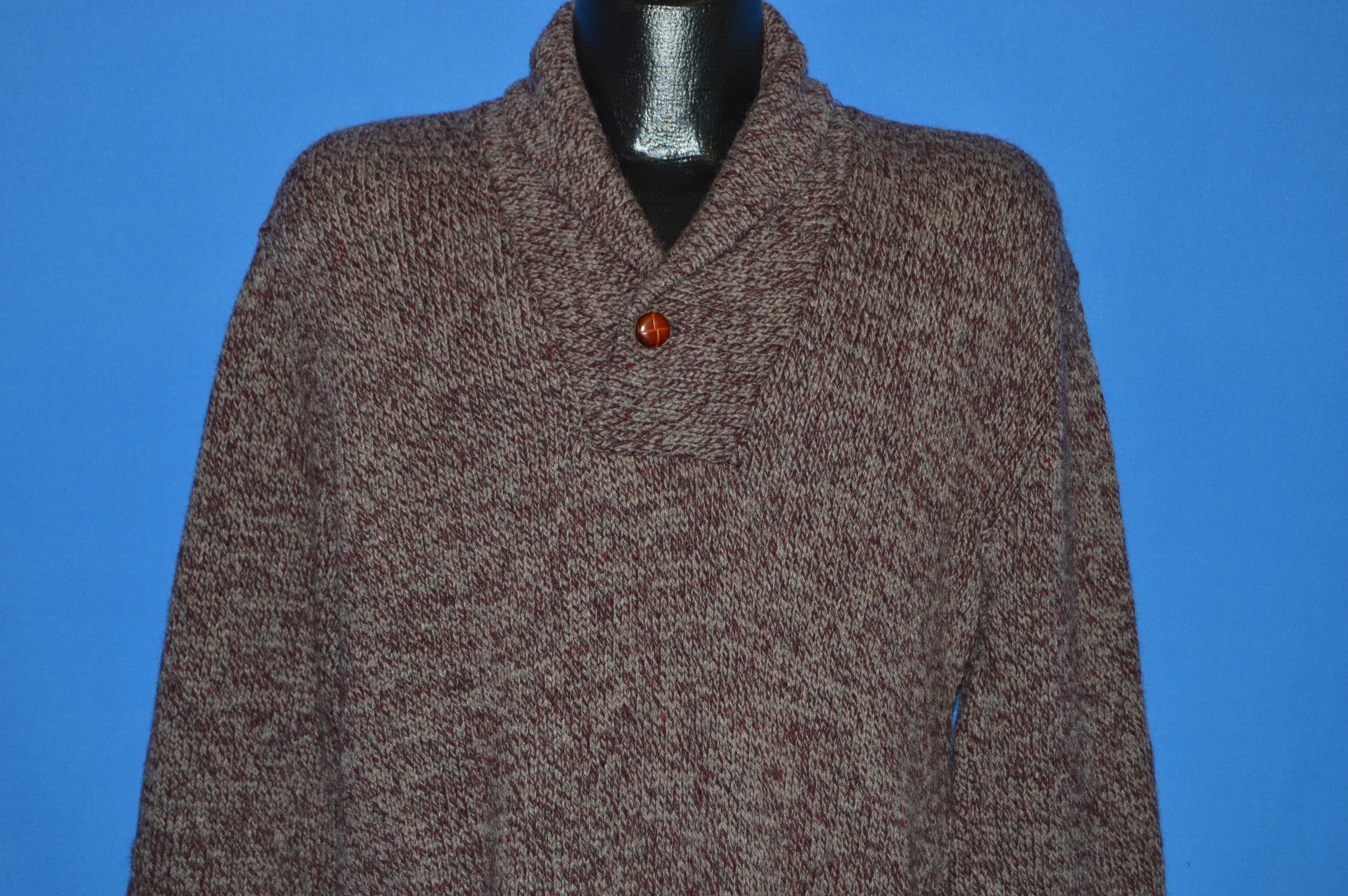 This maroon vintage pullover sweater is made from a knit wool material. The sweater has a shawl neck and a single leather button at the top of the front.