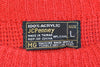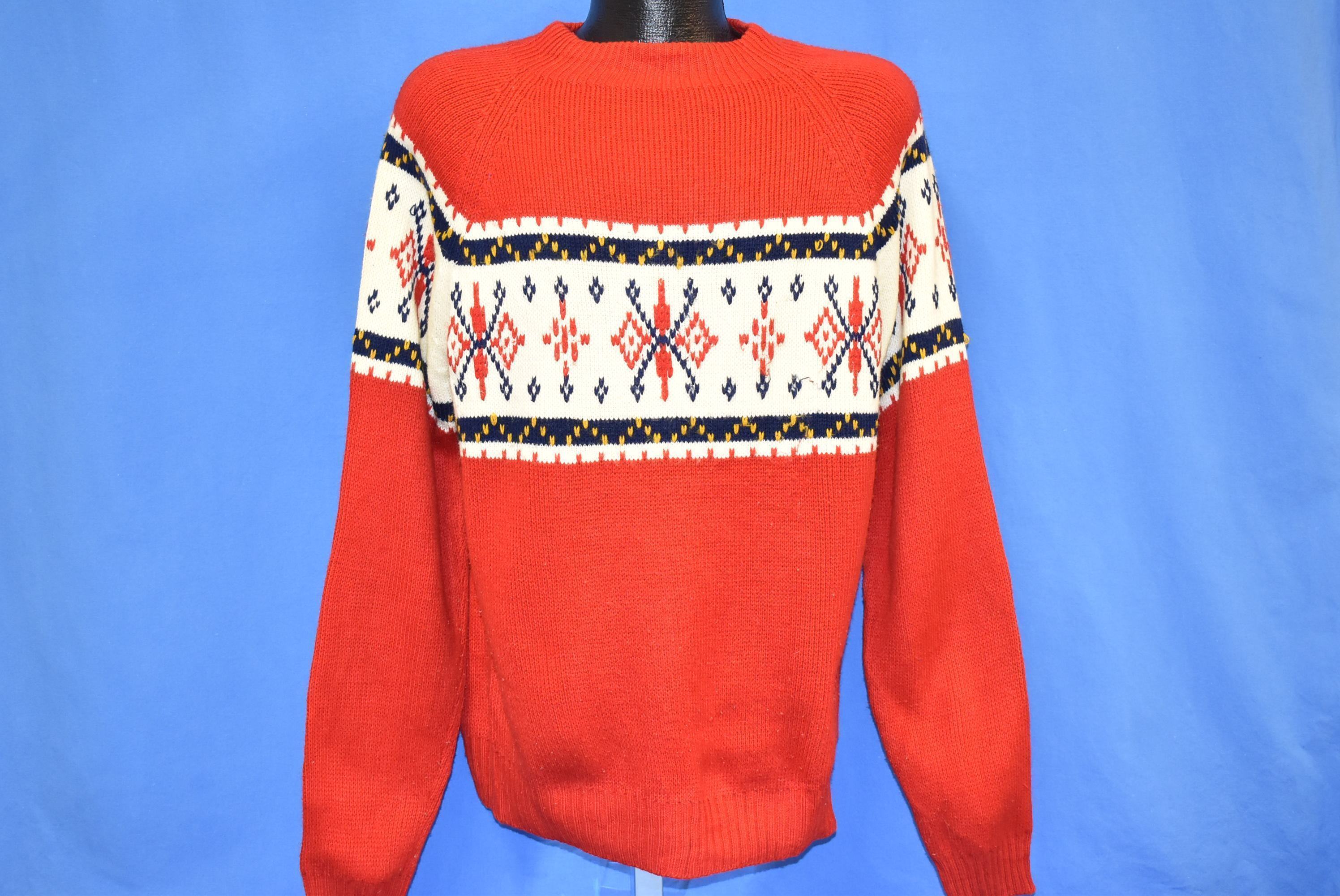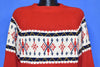 This fun red sweater is great for the holidays. It comes from JC Penney in the 80s and is decked out in an awesome white blue and red snowflake pattern that goes across the front, sleeves, and back.