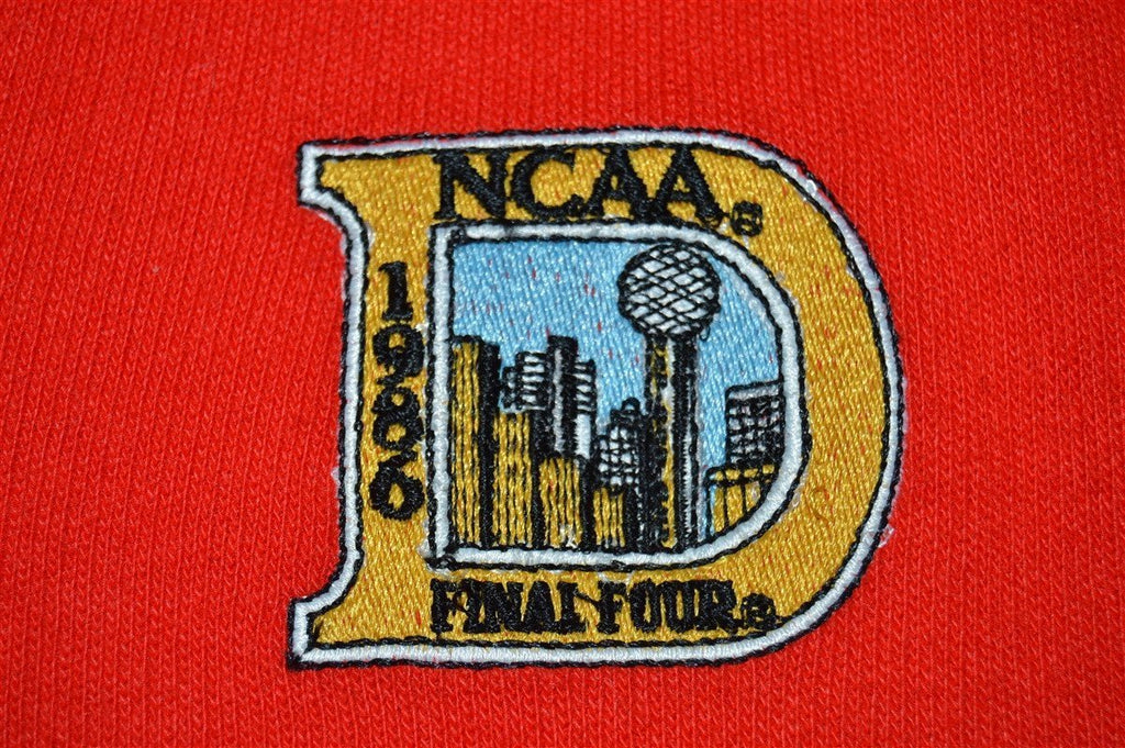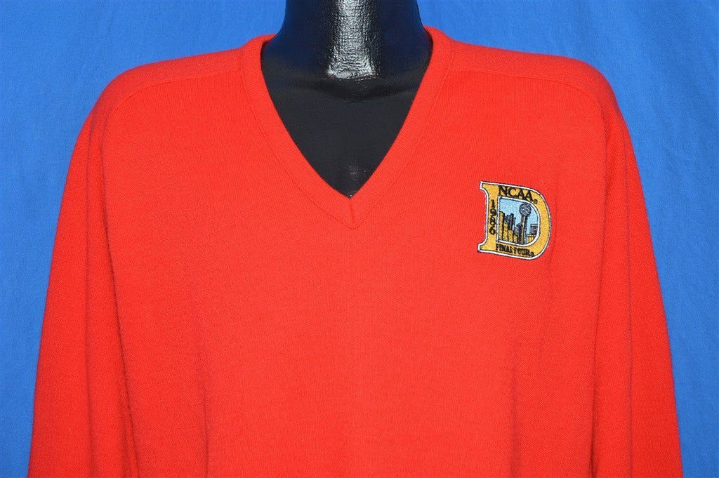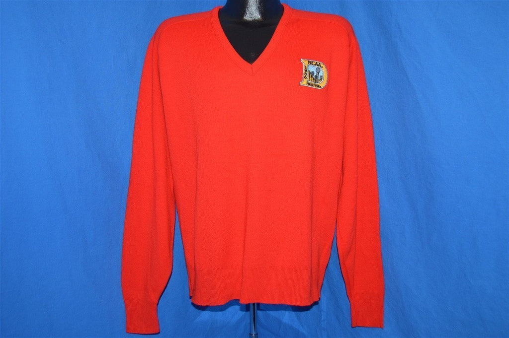 This sweet vintage sweater is from the 80s! Comes in red, featuring a patch design of the 1986 NCAA Final Four. The teams were the Duke Blue Devils, Kansas Jayhawks, LSU Tigers and Louisville Cardinals. The Blue Devils and the Cardinals made it to the championship game, with the Cardinals winning 72-69!