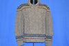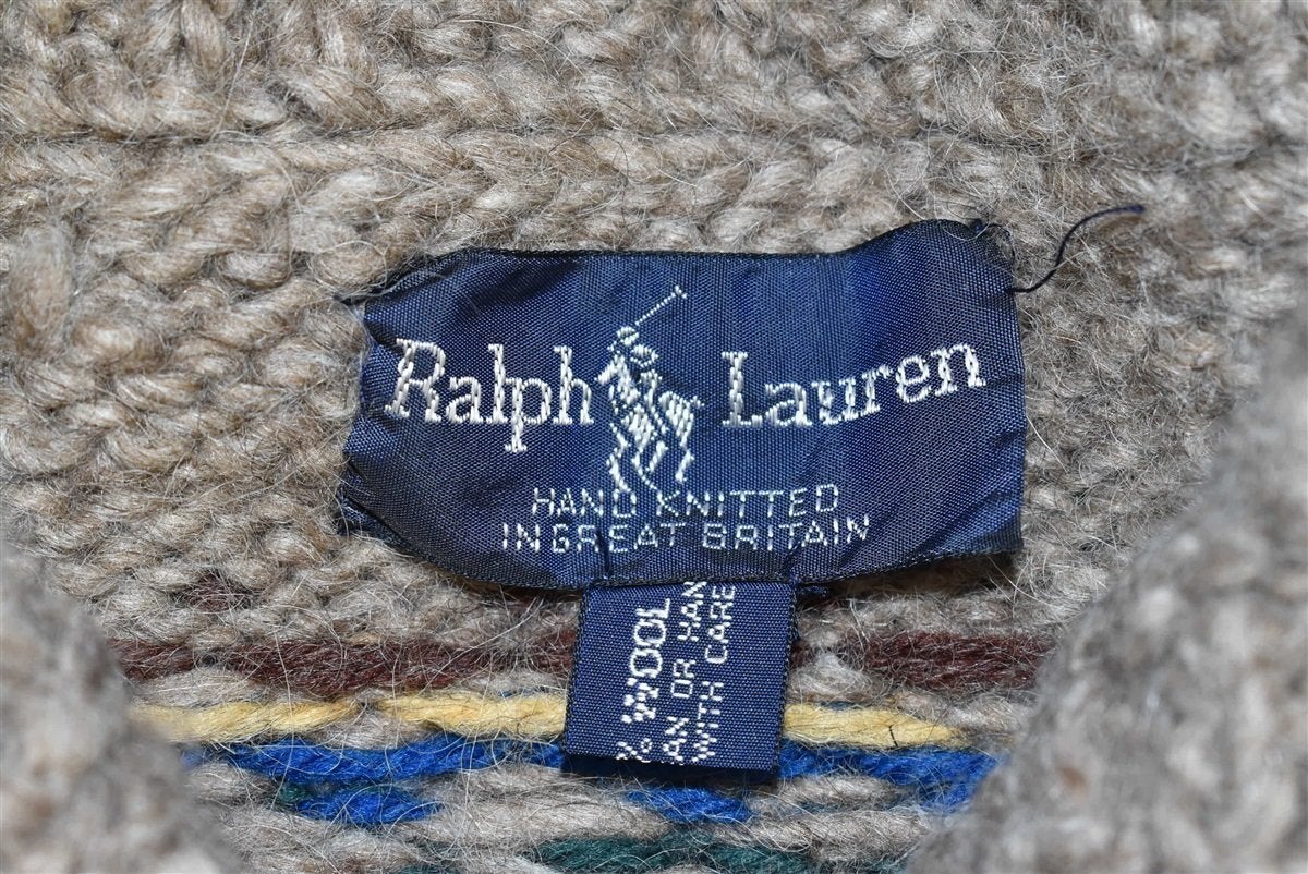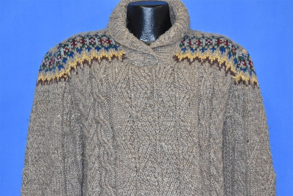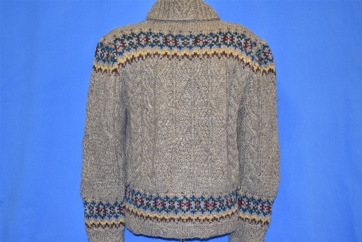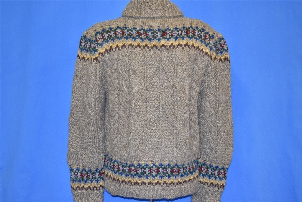 This awesome cable knit sweater is super warm and cozy. It was made back in the 80s by Ralph Lauren and comes in a handsome gray with colored accents around the bottom, cuffs, and shoulders. The sweater also features a stylish shawl neck.