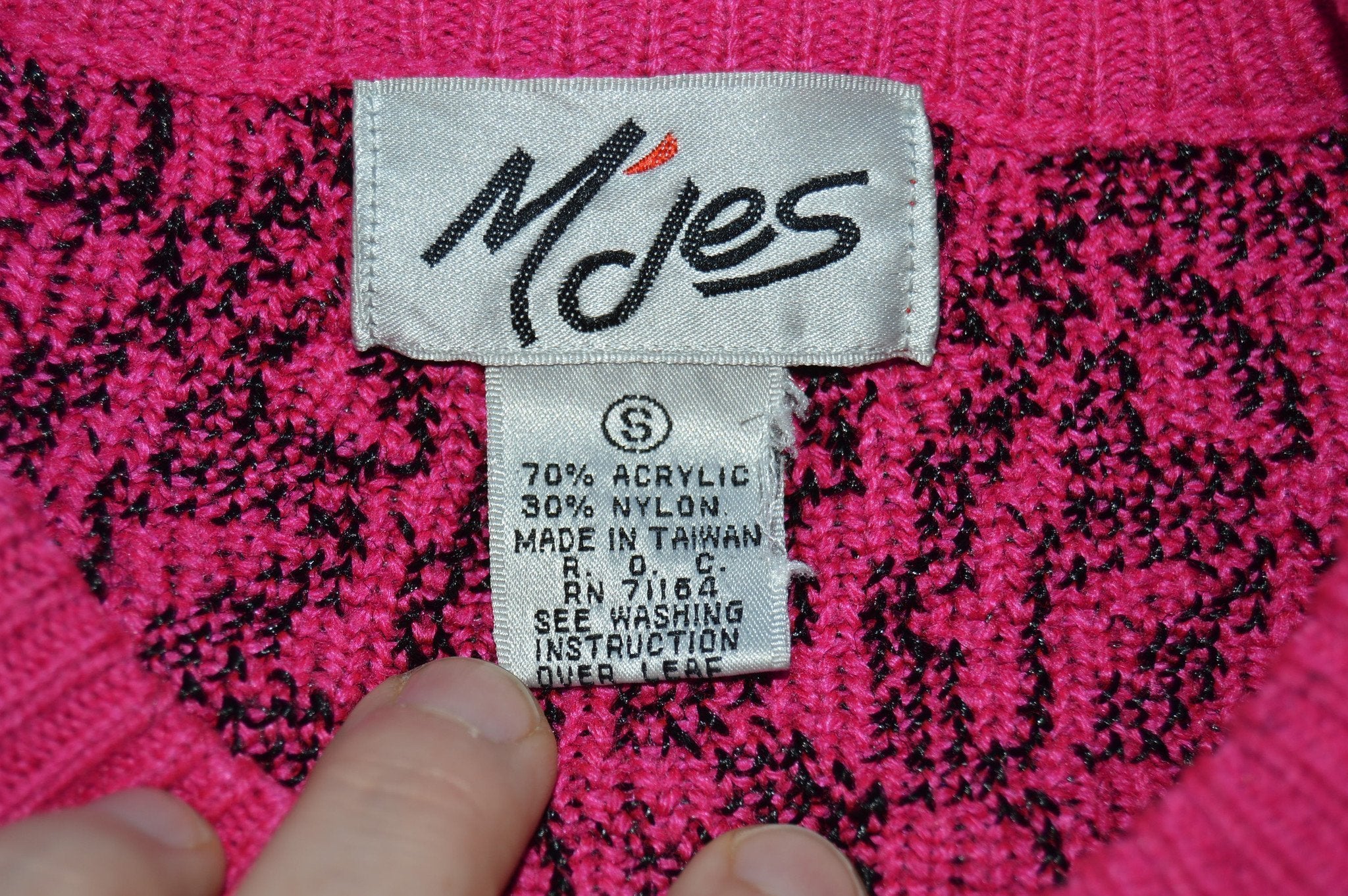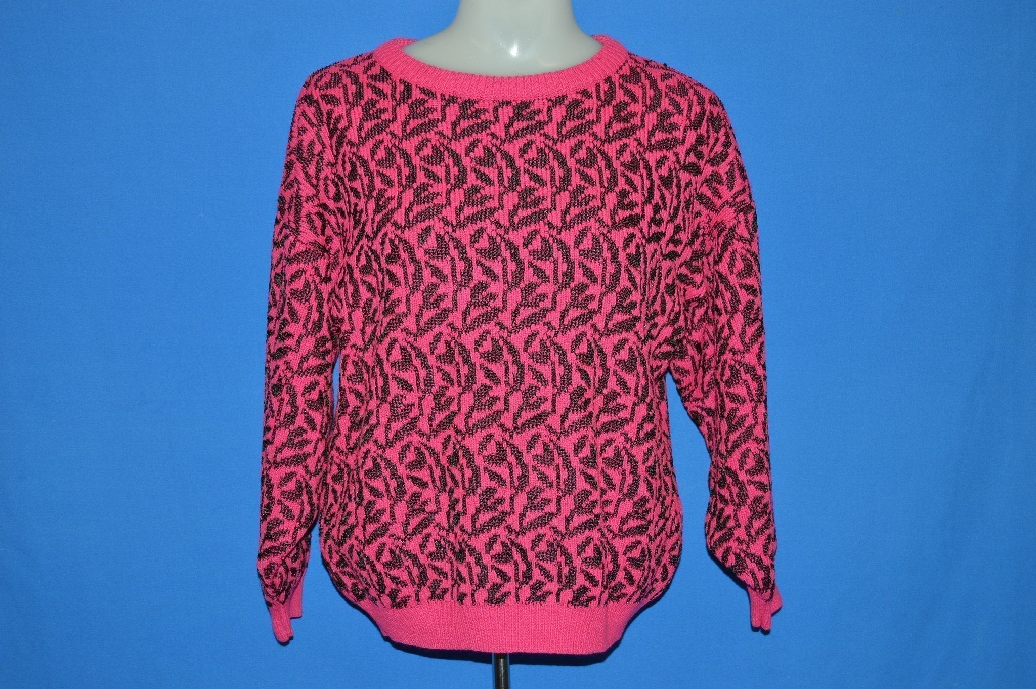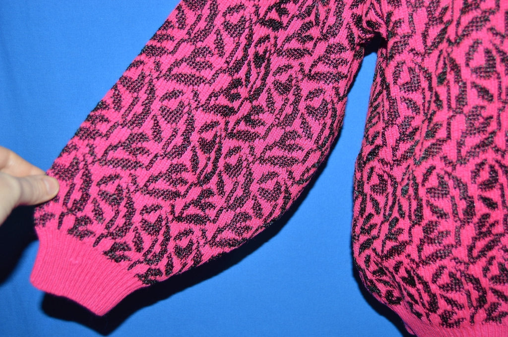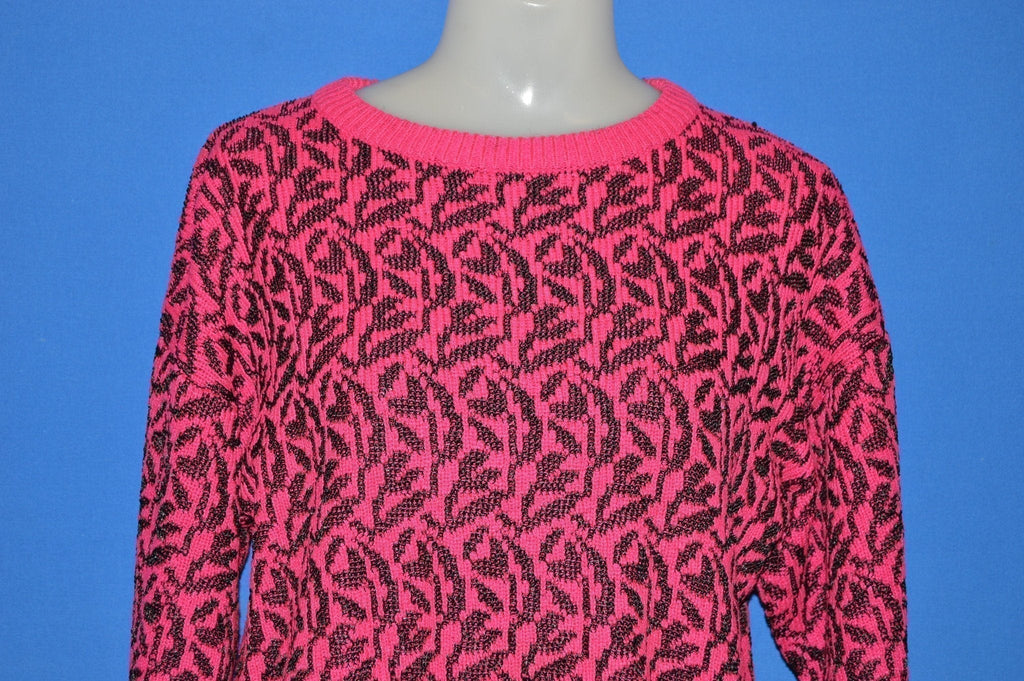 This neon pink and black pullover has a knit leaf pattern all over the sweater.