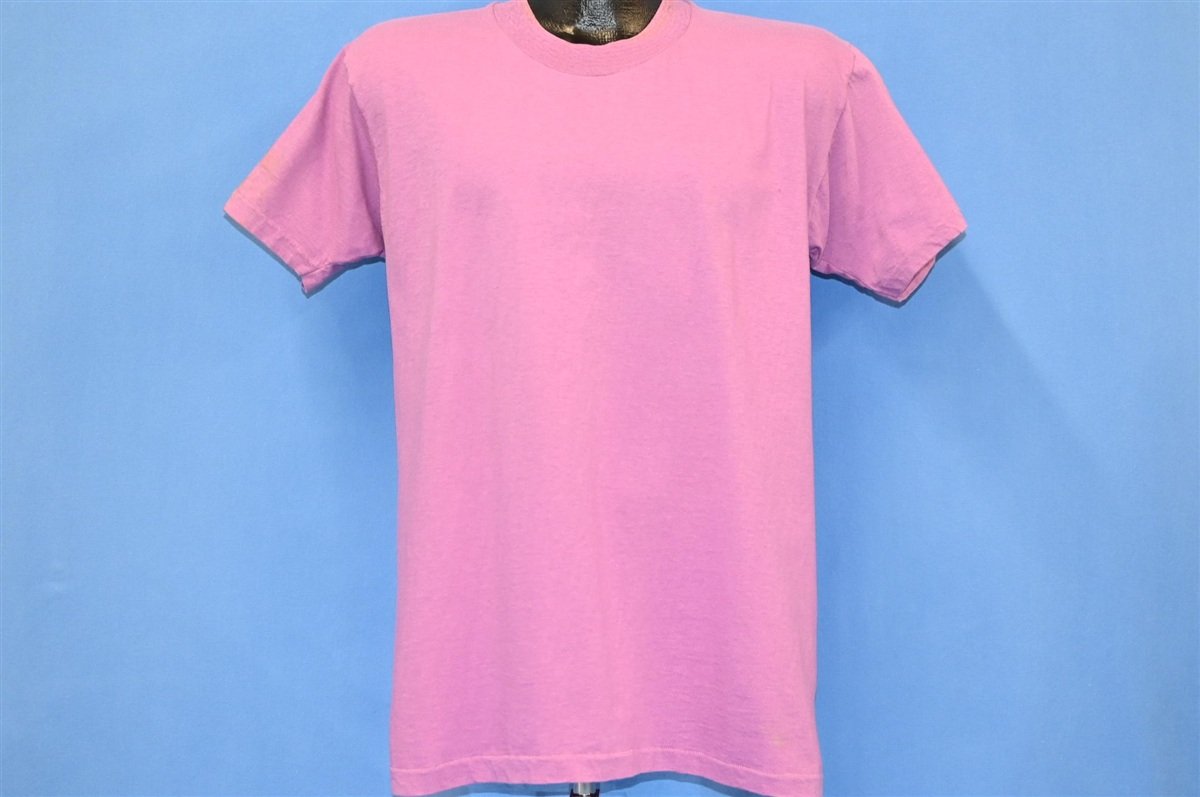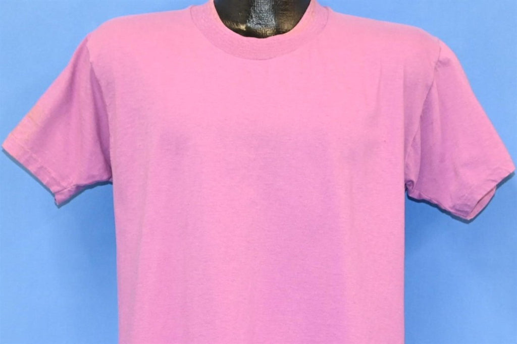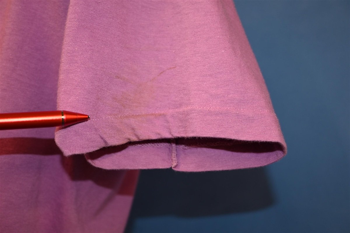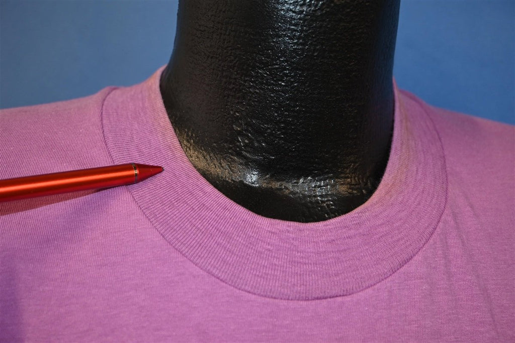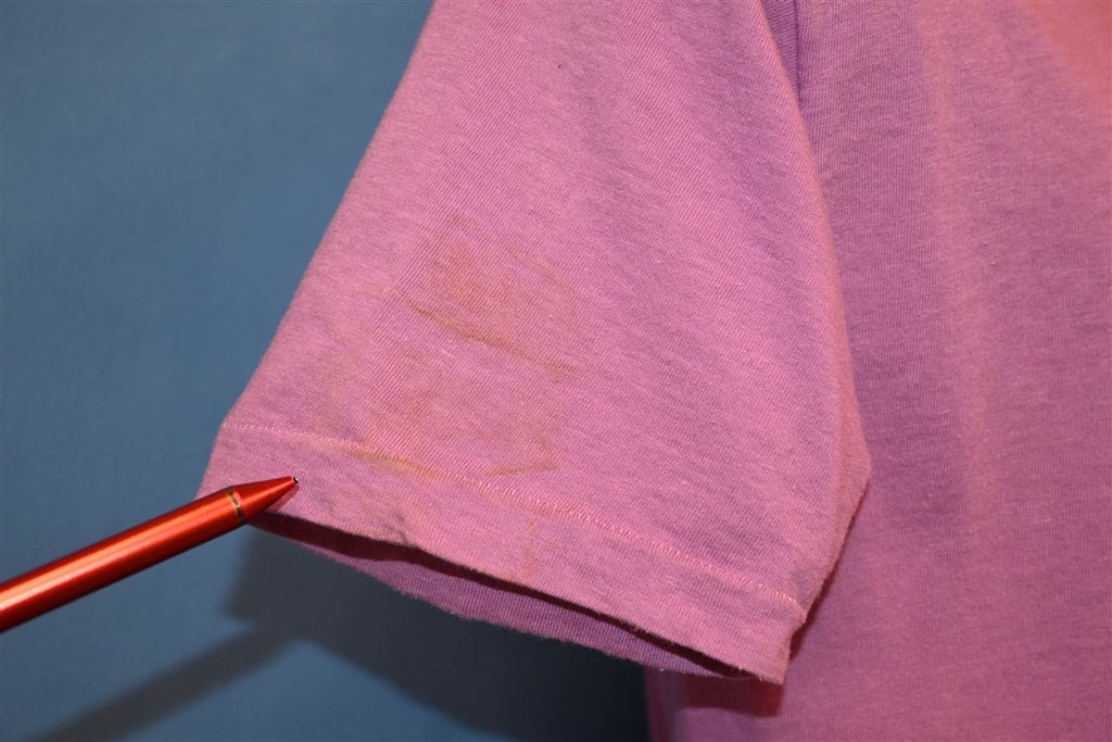 This awesome 70s shirt is totally blank on the front, but the back sports an amazing iron on graphic from Roach Studios. Roach was a titan of the early t-shirt scene during the 60s and 70s, and much of their success was thanks to their bold top notch graphics. By utilizing iron on decals, Roach was able to easily produce graphic tees without the hassle of silk screens. This allowed them to instead focus their efforts on building an impressive portfolio of images. Roach used to employ iconic poster and comix artists like Rick Griffin, David Mann, and Robert Crumb, and they were able to do this thanks to former Roth Studios artist Ed Newton. Roach employed Newton in the early 70s, and he gave the company access to all of his custom car and underground artist friends. This vibrant neon design was actually drawn by Newton himself, and if you look closely you can find his signature hidden within the graphic.