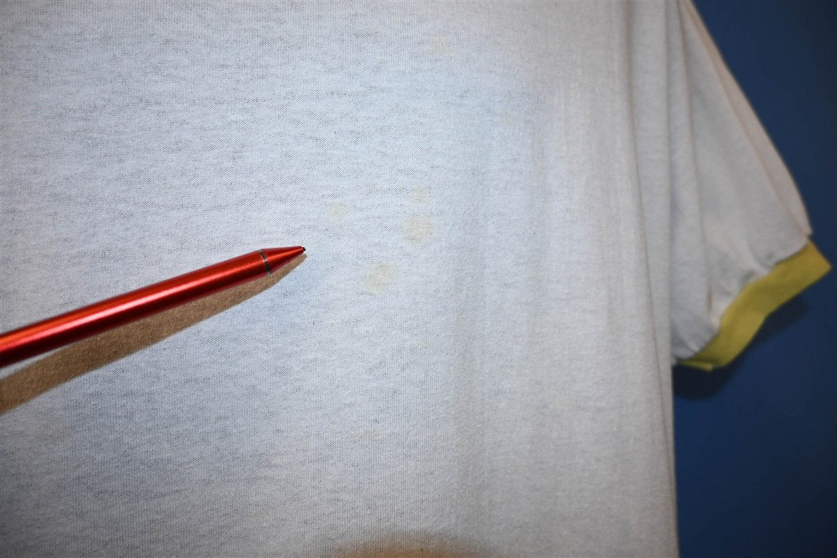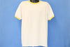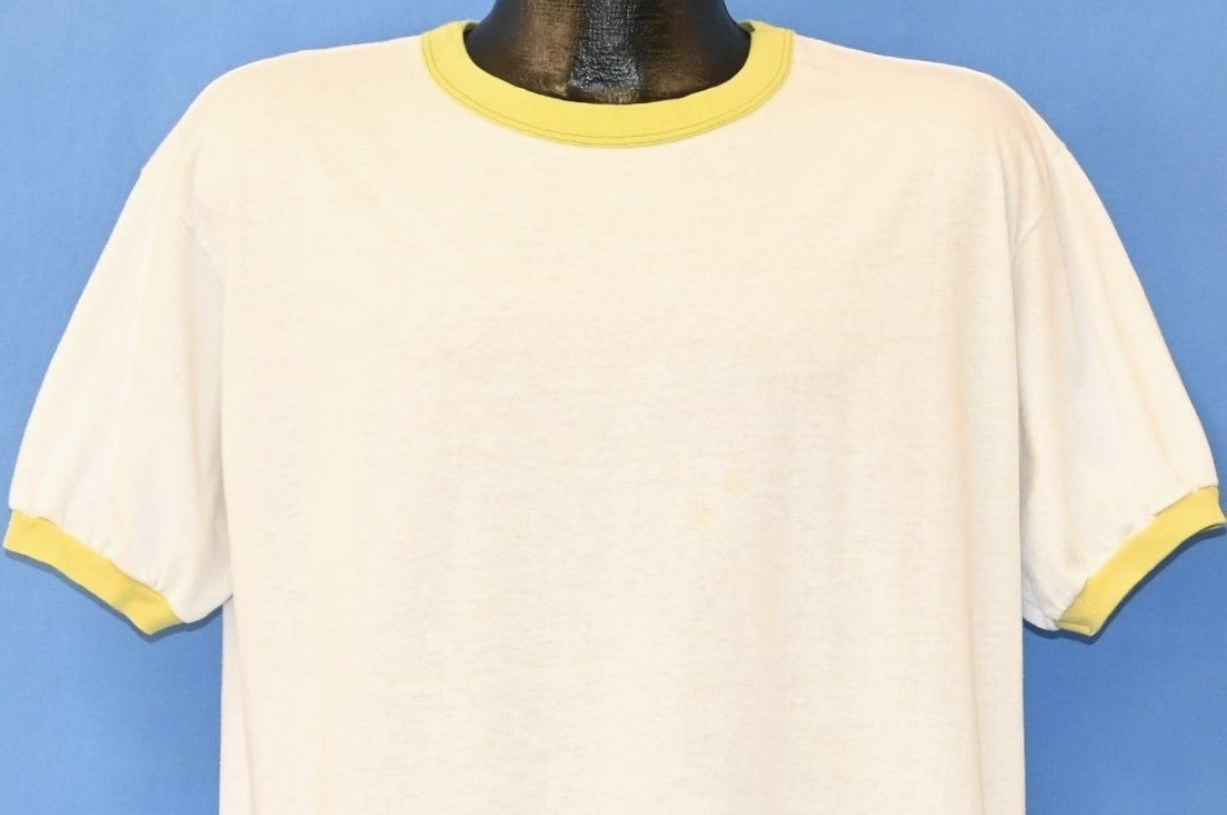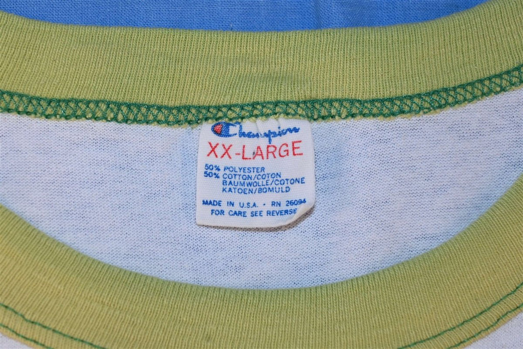 This vintage tee is totally blank without any graphics on the front or back. This shirt is plain white, but it does have a stylish ringer collar in a unique shade of lime green. This tee was made by the classic sportswear company Champion, which dates all the way back to the early 20th Century, when it was known as the Knickerbocker Knitting Company.