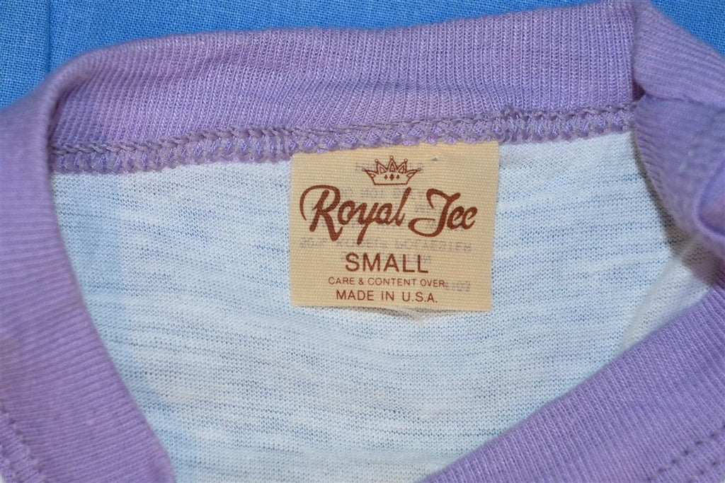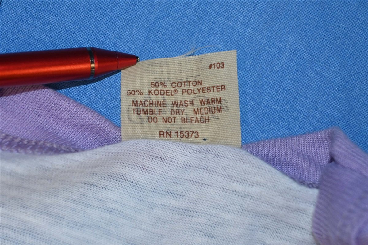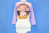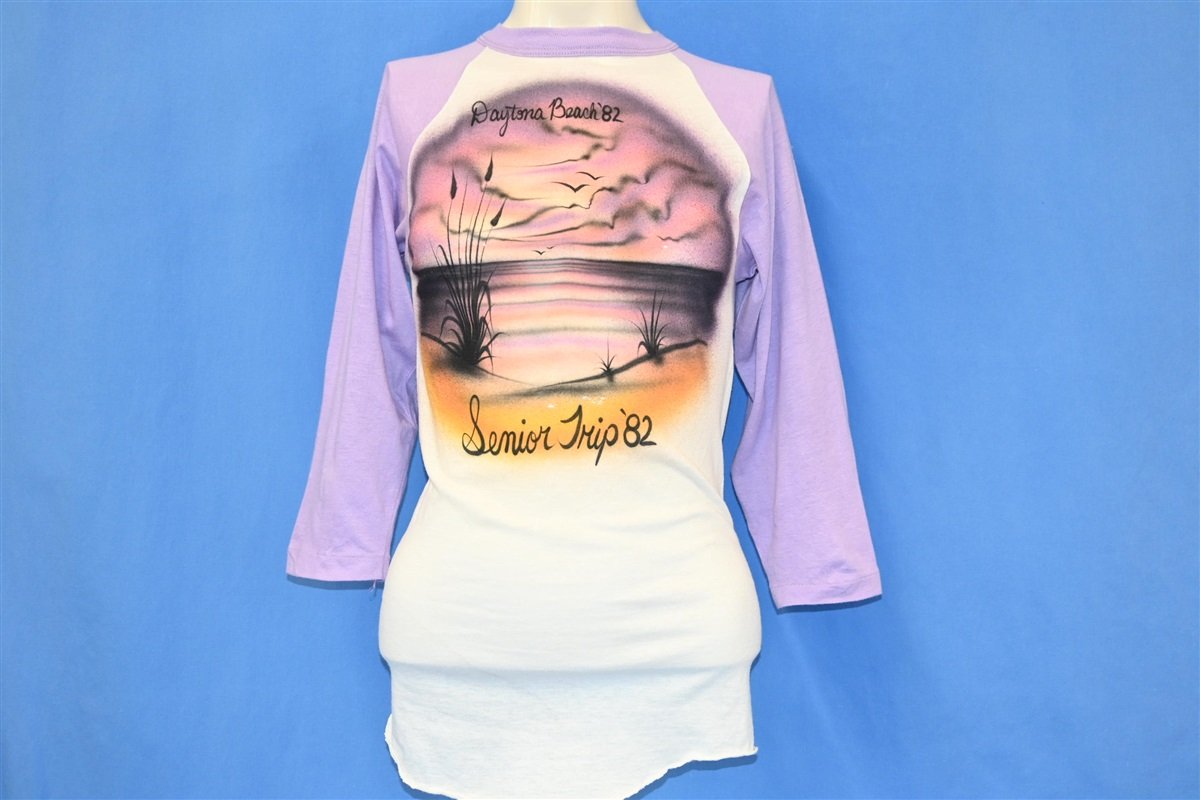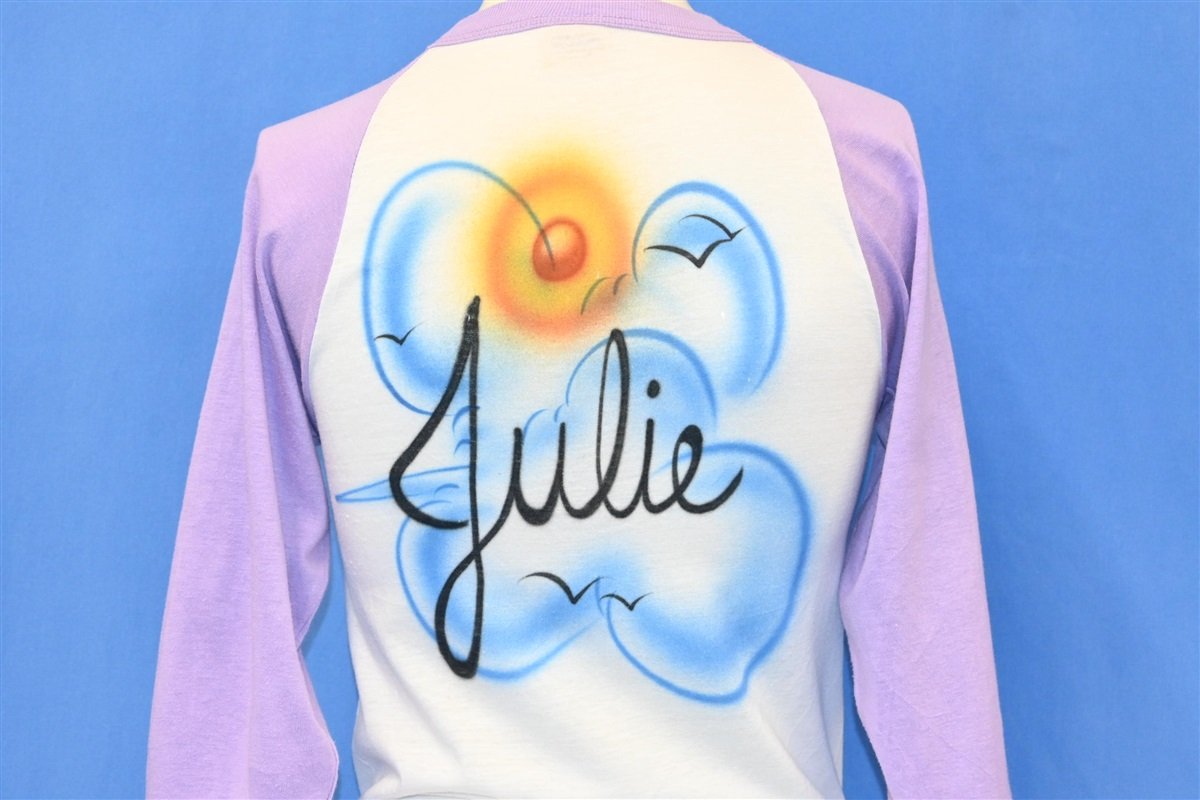 This awesome raglan tee is from a senior trip to Daytona Beach, Florida in 1982. This shirt has been personalized with double-sided airbrush graphics, and it's a great example of the type of airbrushed t-shirts that used to make for popular boardwalk souvenirs. The front has an amazing sunset beach scene while the back has the name Julie.