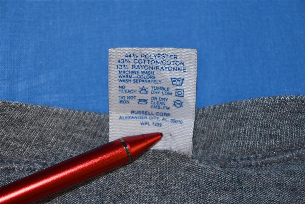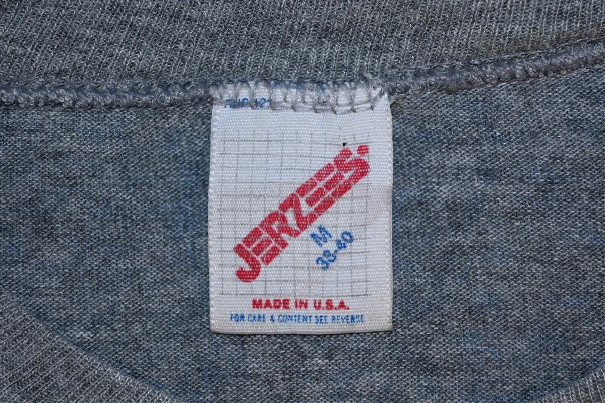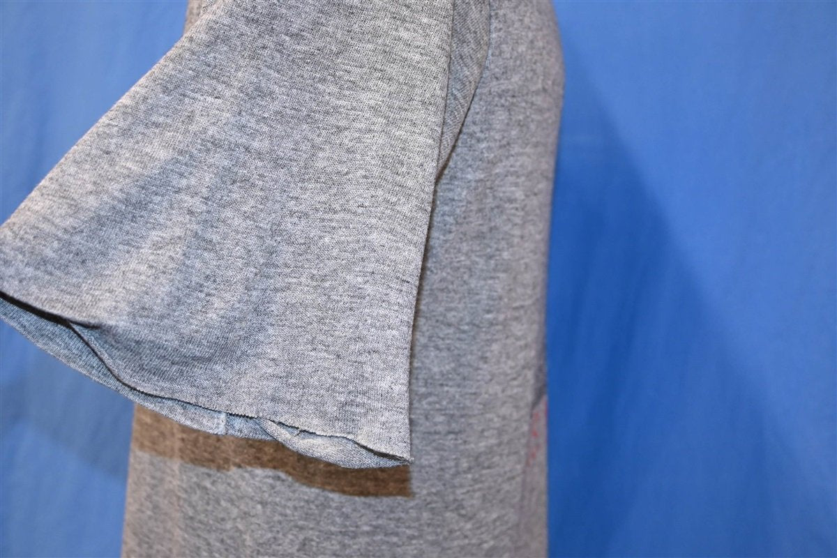 Fits like a modern unisex adult medium. This shirt is distressed. It is very soft and thin with small holes, paint stains, and the seam on the sleeve coming undone, see pics