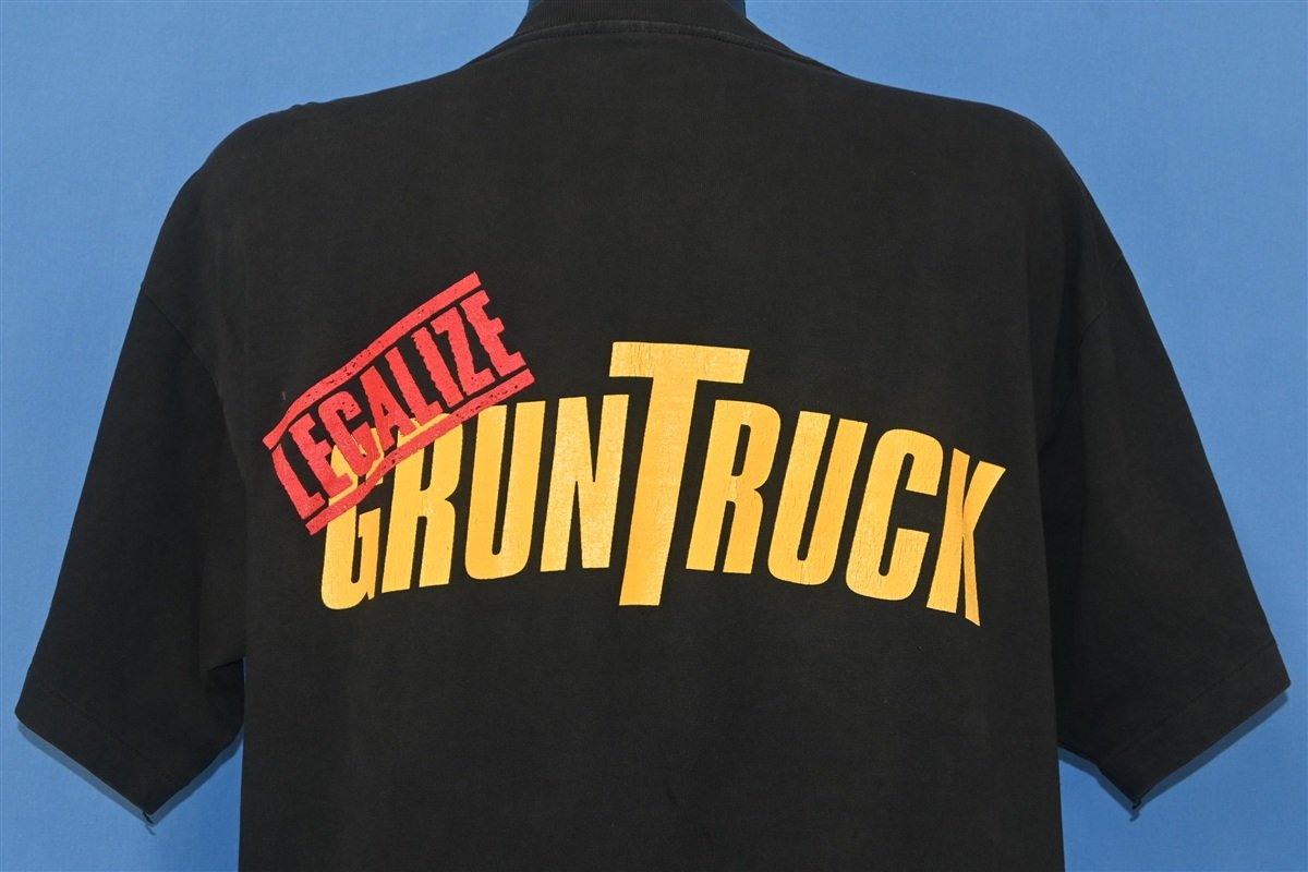 This awesome double sided tee encourages you to "Legalize Gruntruck". The shirt was made for the Seattle-based grunge band, and it celebrates their 1992 album, Push. Gruntruck formed in 1989, right around the time that grunge began to rise to mainstream popularity. As the genre took off, several labels descended onto the Seattle scene, and the band wound up signed to Roadrunner Records.