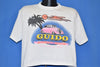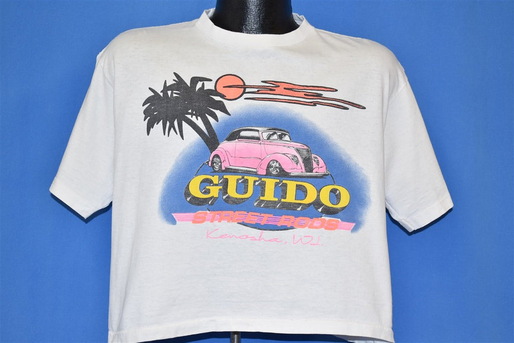 This classic promo tee was specially made for Guido Street Rods, a car shop in Kenosha, Wisconsin. It's a nineties original loaded with an epic classic car graphic, amazing one hundred percent cotton, and a cool crop style. The images of a sunset and palm tree are really reminiscent of old school vacation tees.