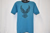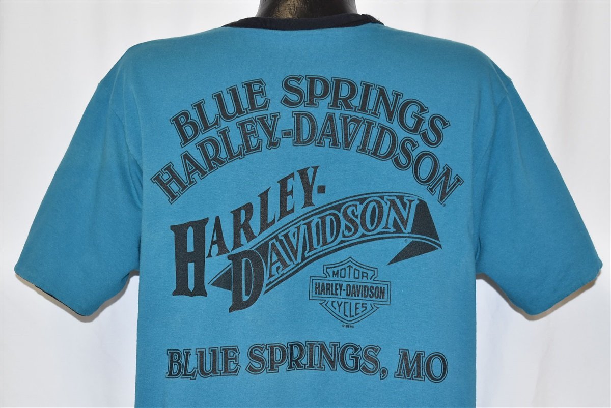 This classic biker tee is dedicated to the Blue Springs Harley-Davidson dealership in Missouri. It's a 1990s original loaded with awesome graphics, amazing one hundred percent cotton, and is fully reversible- one blue side, one black.