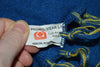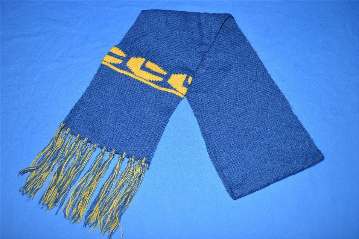 This vintage scarf is blue with yellow knit hexagon and tassel designs.