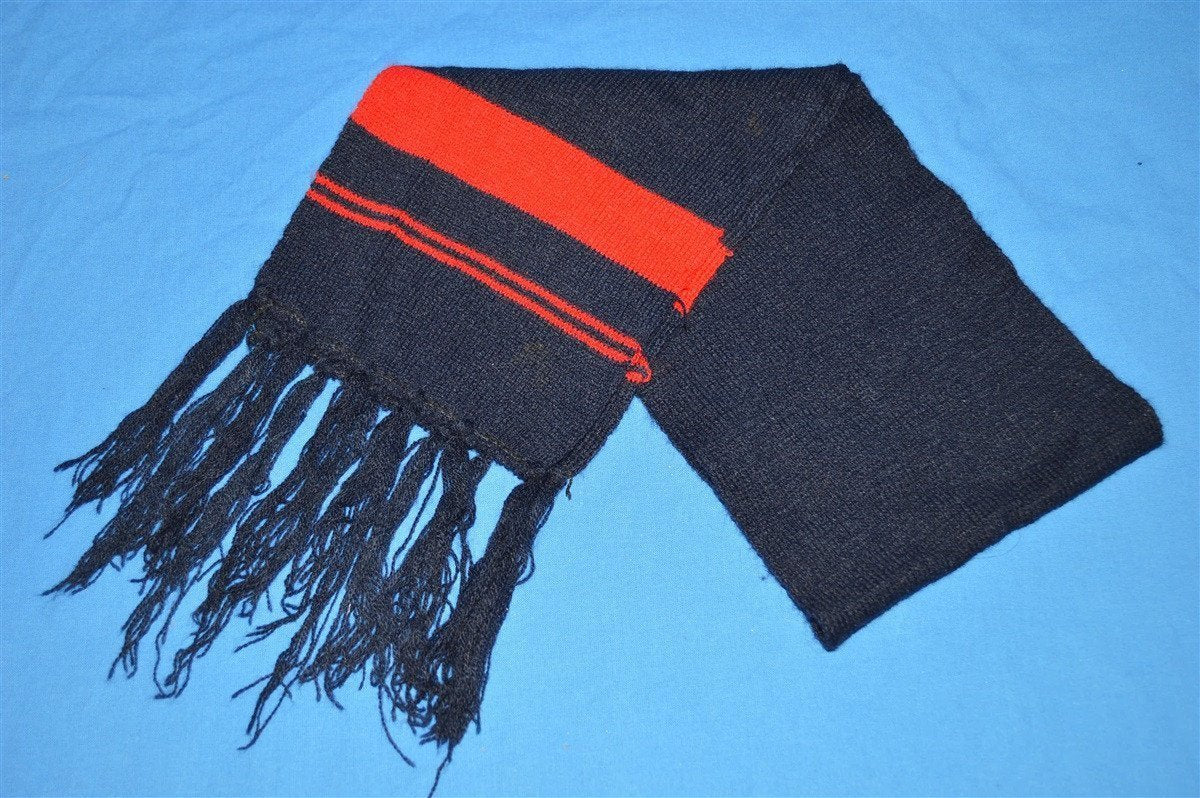 This blue vintage ski scarf has red stripes and blue tassel fringe at both ends.