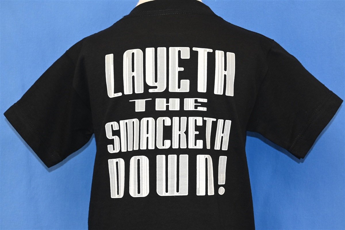 This sweet vintage kid's tee celebrates the beloved WWF wrestler Dwayne "The Rock" Johnson, and the back of this tee says "Layeth the Smacketh Down!" Despite spending the majority of his pro career as a heel character, The Rock was one of the biggest stars of the WWF's Attitude Era. In fact, fans weren't particularly enthralled by Johnson until he turned heel, roughly a year into his time with the World Wrestling Federation. The turn allowed Johnson to showcase his quick wit and sharp comebacks, and fans quickly fell in love with his expert smack talking skills. With this new persona, The Rock became known for having some of the WWF's most entertaining in-ring moments.