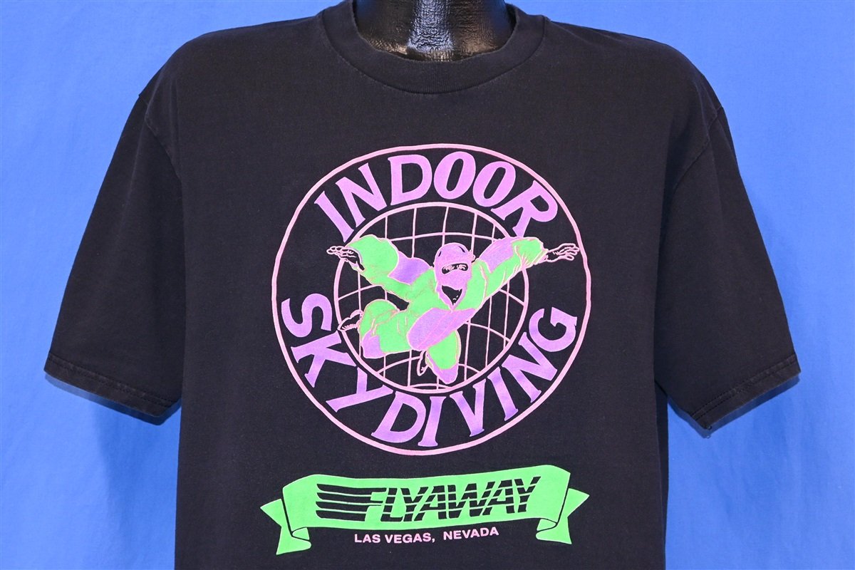 This cool tee is a souvenir from the 90s that features a rad neon graphic advertising Flyaway Indoor Skydiving, an indoor skydiving venue found in Las Vegas, Nevada. Flyaway first opened in 1982, and since that time it has offered Las Vegas tourists and locals the exciting chance to enjoy indoor skydiving in a wind tunnel powered by a 1,000 hp electric motor that's attached to the propeller of a DC-3 aircraft. The venue is located just off the Vegas strip for thrill seekers who want to try something a little different from gambling.
