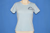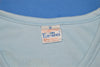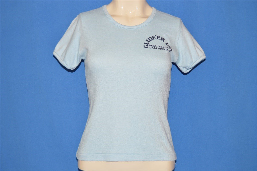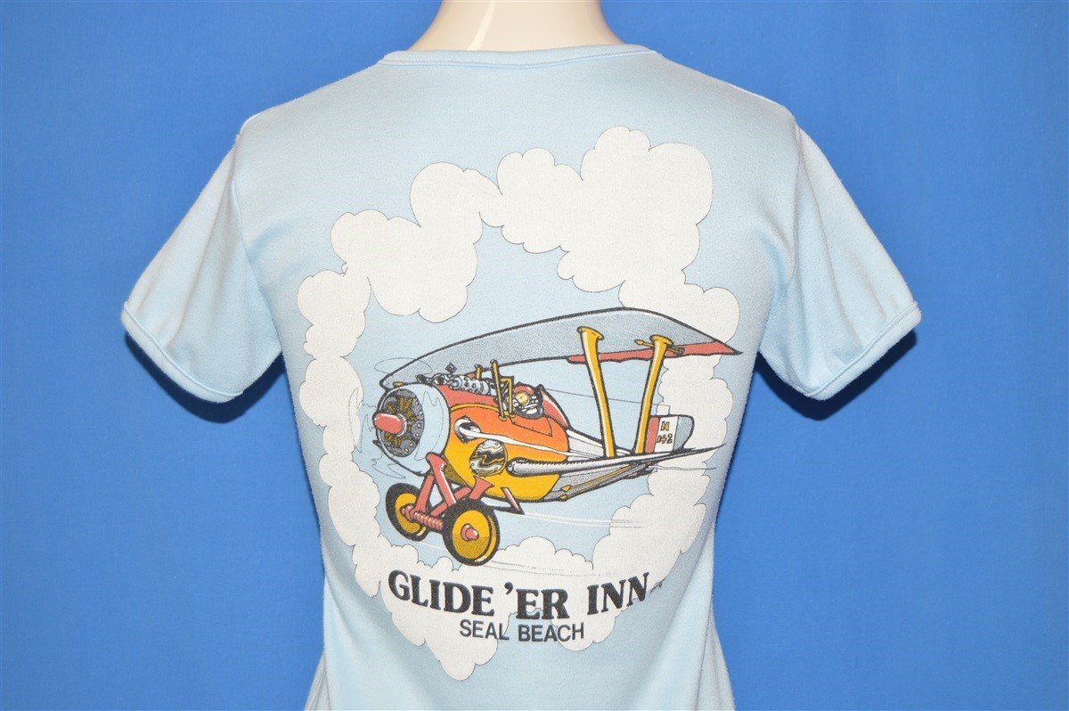 This t-shirt is from the 80s and the back features a large graphic of a biplane flying through the clouds with the text "Glide 'Er Inn" and "Seal Beach" underneath. The Glide 'Er Inn was a fresh seafood restaurant and museum located in Orange County, California. Founded in 1930, the Inn was well-known for being a popular hangout for some of Orange County's most notable aviators. On the front of the shirt, the text reads "Glide 'Er Inn" and "Seal Beach California."