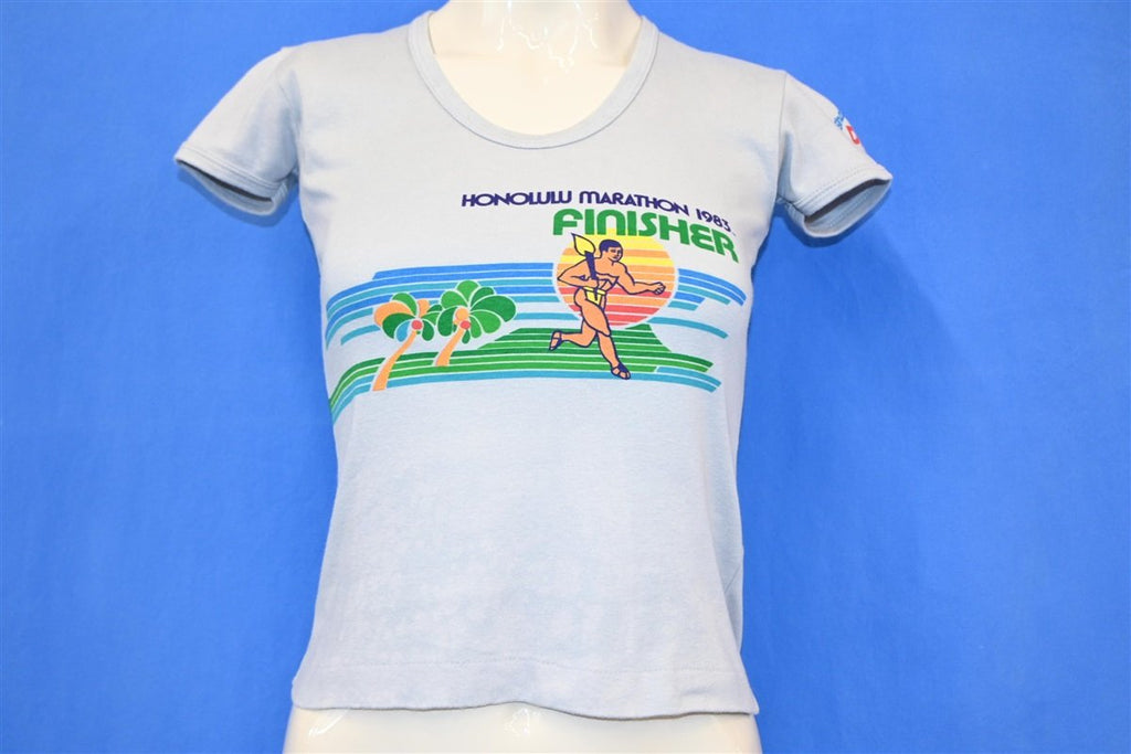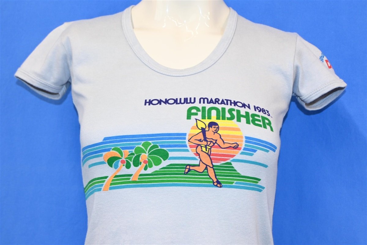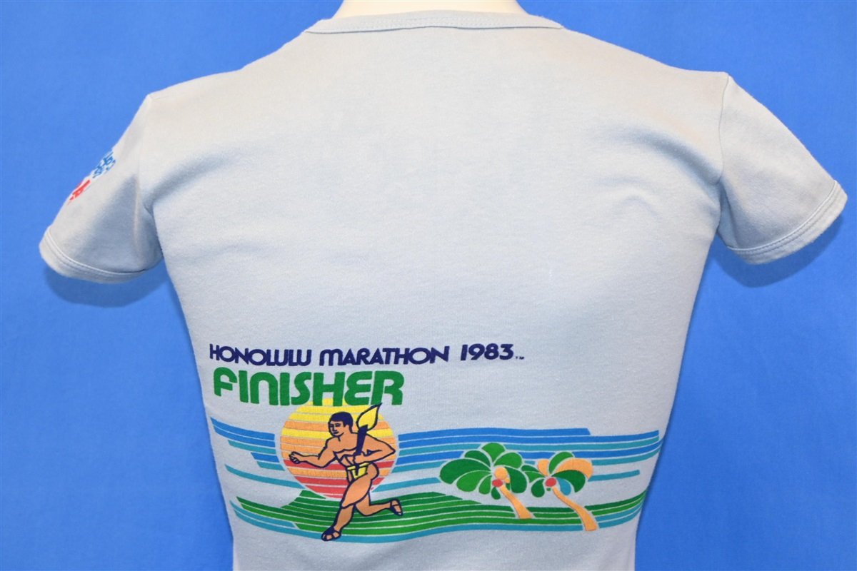 This great tee is from the world famous Honolulu Marathon in 1983. The Honolulu Marathon is one of the most popular in the world for many reasons, including being open to all and having no restrictions for entry. Many marathons of this size have qualifications for entry including time-qualifications, so the Honolulu Marathon is very popular for first time runners. The marathon is particularly popular with Japanese runners and has been sponsored by Japan Air Lines since 1985.