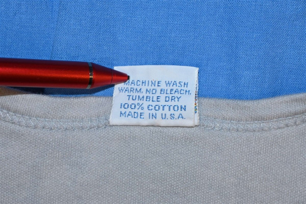 The tag says Small, but the shirt fits like a modern women's XS. There is slight discoloration throughout the entire fabric of the shirt. The graphic is on the left sleeve while wearing.