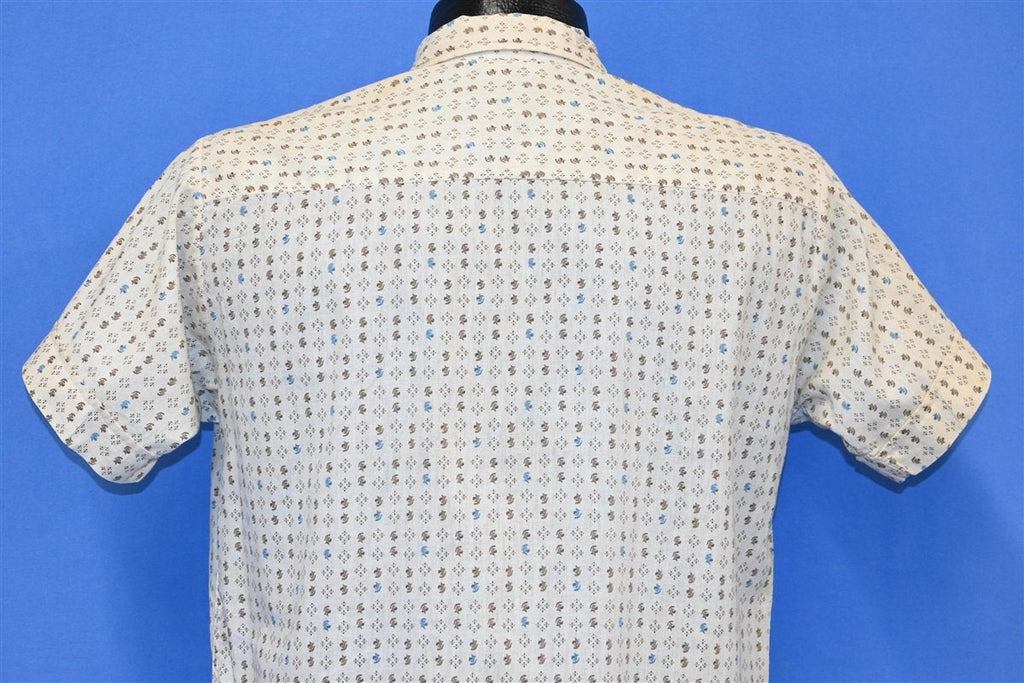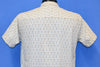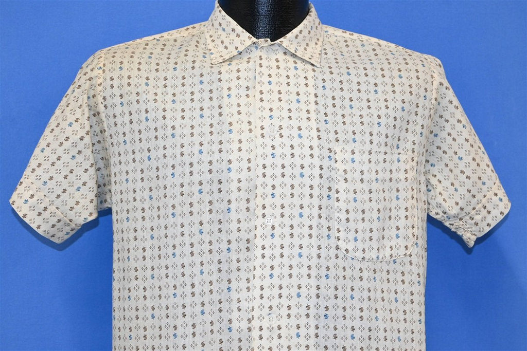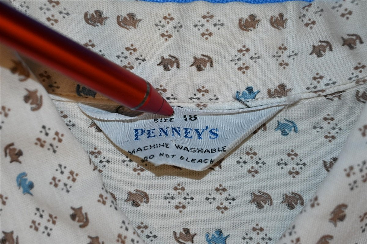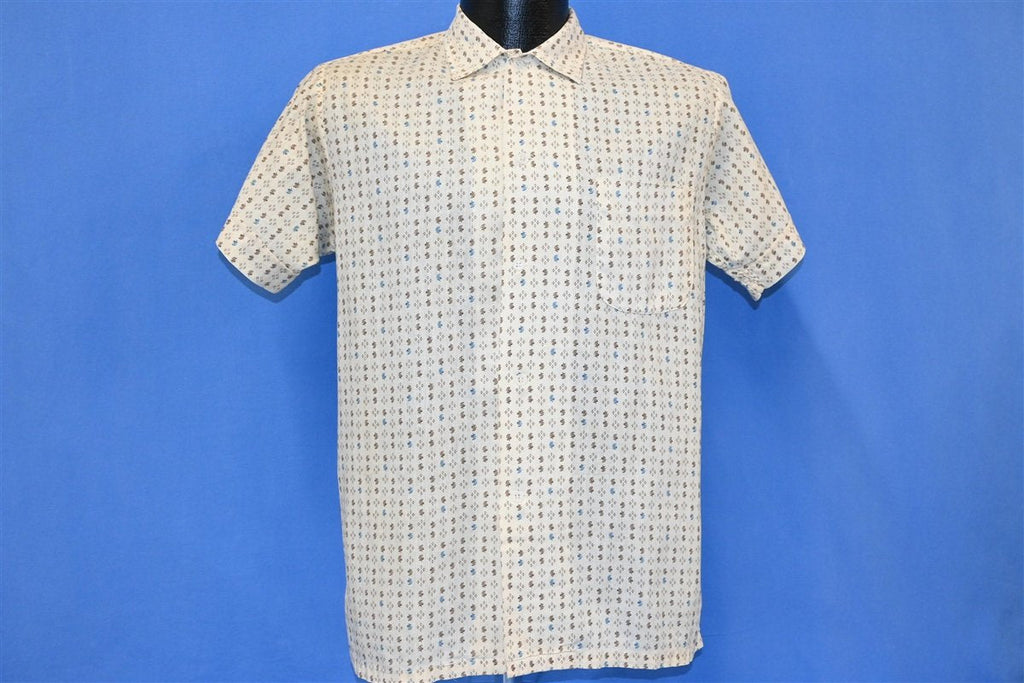 This classic button down was made by Penney's all the way back in the 1950s. This shirt comes in a timeless shade of off white and it has a subtle pattern consisting of little knights' helmets. The shirt has a single chest pocket and the buttons stop around the waist, making it the perfect button down to pair with some high-waisted trousers.