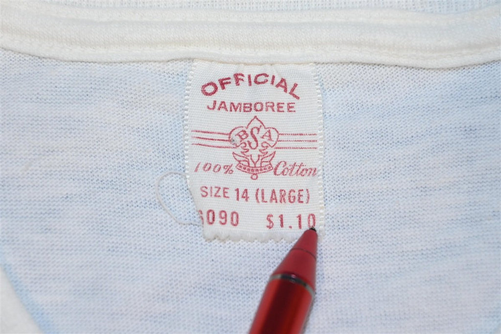 This vintage shirt is in amazing condition from the 1960s. This tee is an official Boy Scouts of American shirt that was made in honor the BSA's Golden Jubilee. Held in 1960, this edition of the National Scout Jamboree marked the Boy Scouts' 50th anniversary, and it featured the theme "For God and Country".