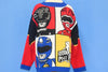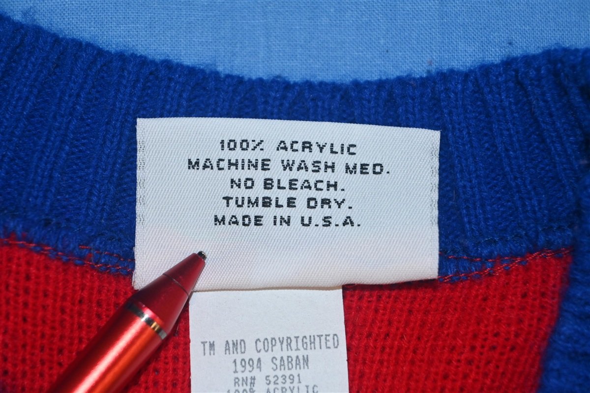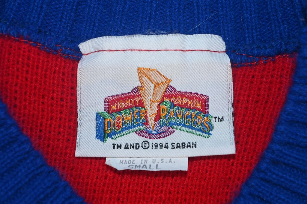 This cool and cozy sweater promotes the action-packed television series, Mighty Morphin' Power Rangers. The show first aired on Fox Kids in 1993, and it was inspired by the Super Sentai franchise from the Japanese entertainment company, Toei. This sweater is made from soft acrylic fibers, and it has a bold colorblocked design showing off several of the characters. Featured on the front are the Red Ranger Jason Lee Scott, the Black Ranger Zack Taylor, and the Blue Ranger Billy Cranston.