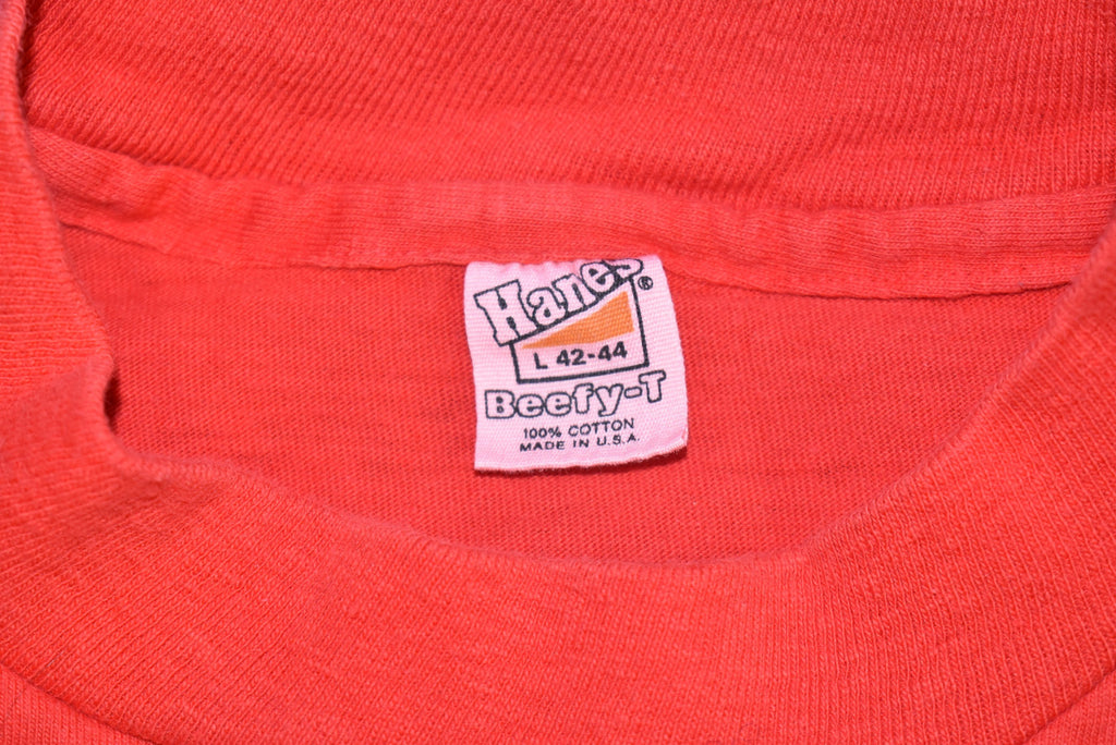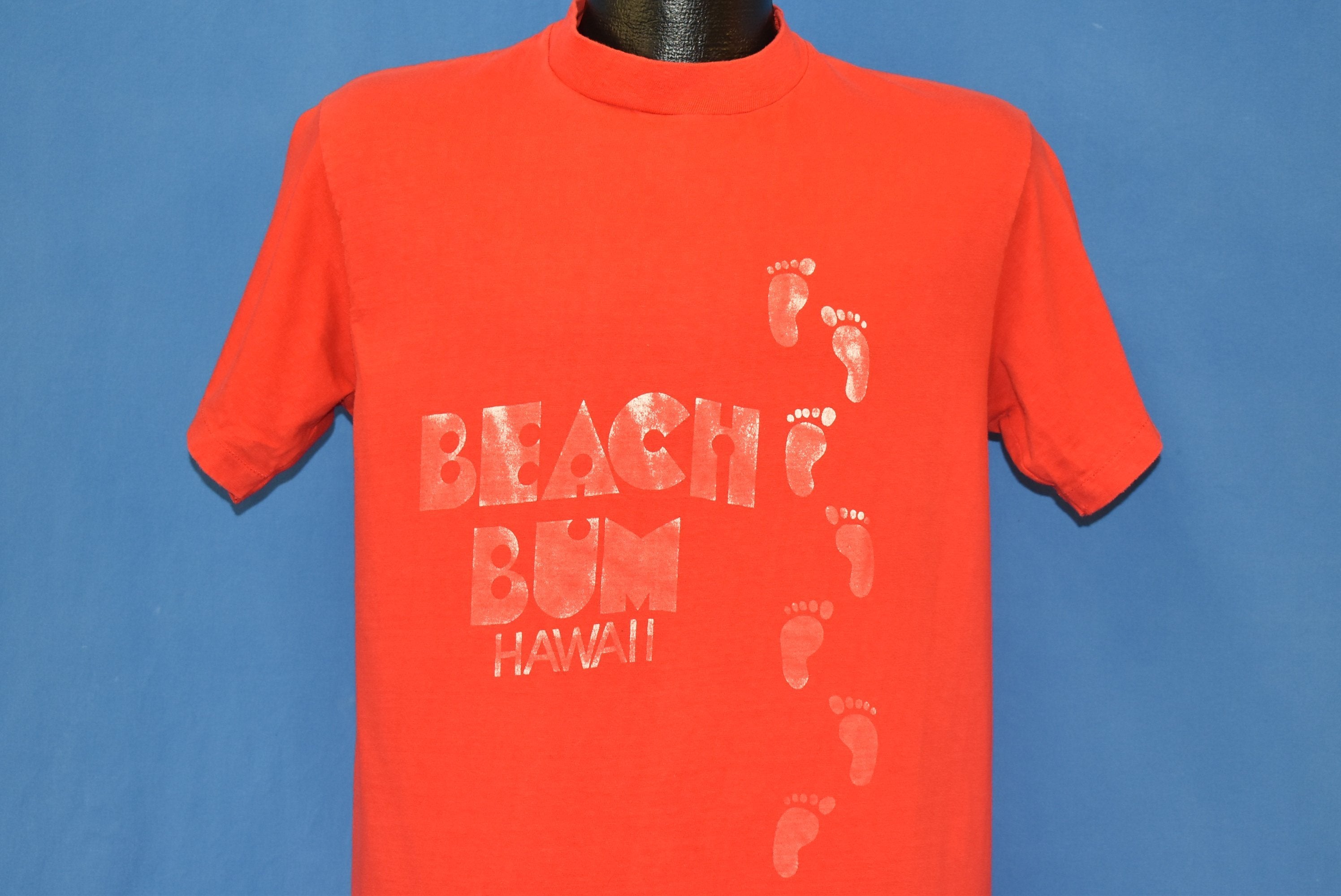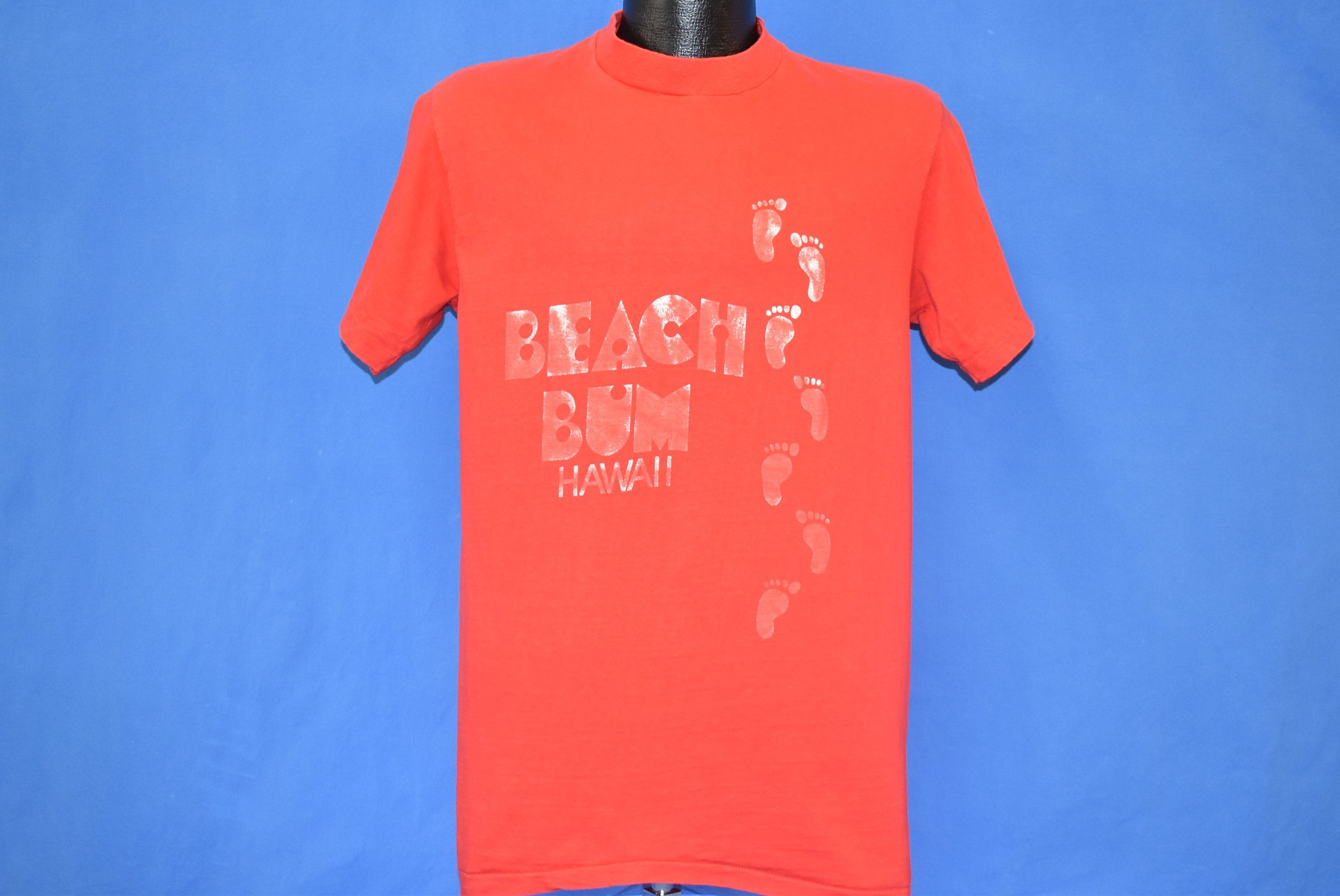 This red tourist shirt has a graphic on the front of footprints in the sand. Beside this, it says "Beach Bum Hawaii". Hawaii, an archipelago in the Pacific Ocean and the 50th American state, is known for its many beautiful beaches.