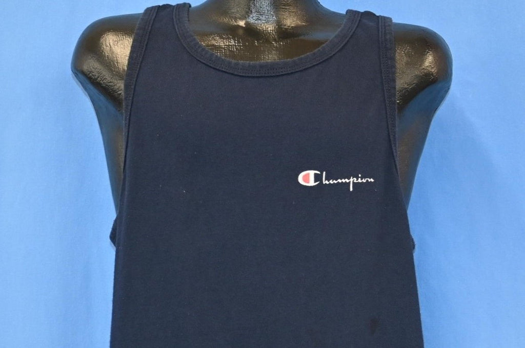 This navy blue tank was made by the classic sportswear manufacturer, Champion. The company has a long and storied history that dates back to 1919, when they were established as the Knickerbocker Knitting Company. Over the years, Champion has produced uniforms for the US Military Academy, NBA, NFL, and several NCAA teams.