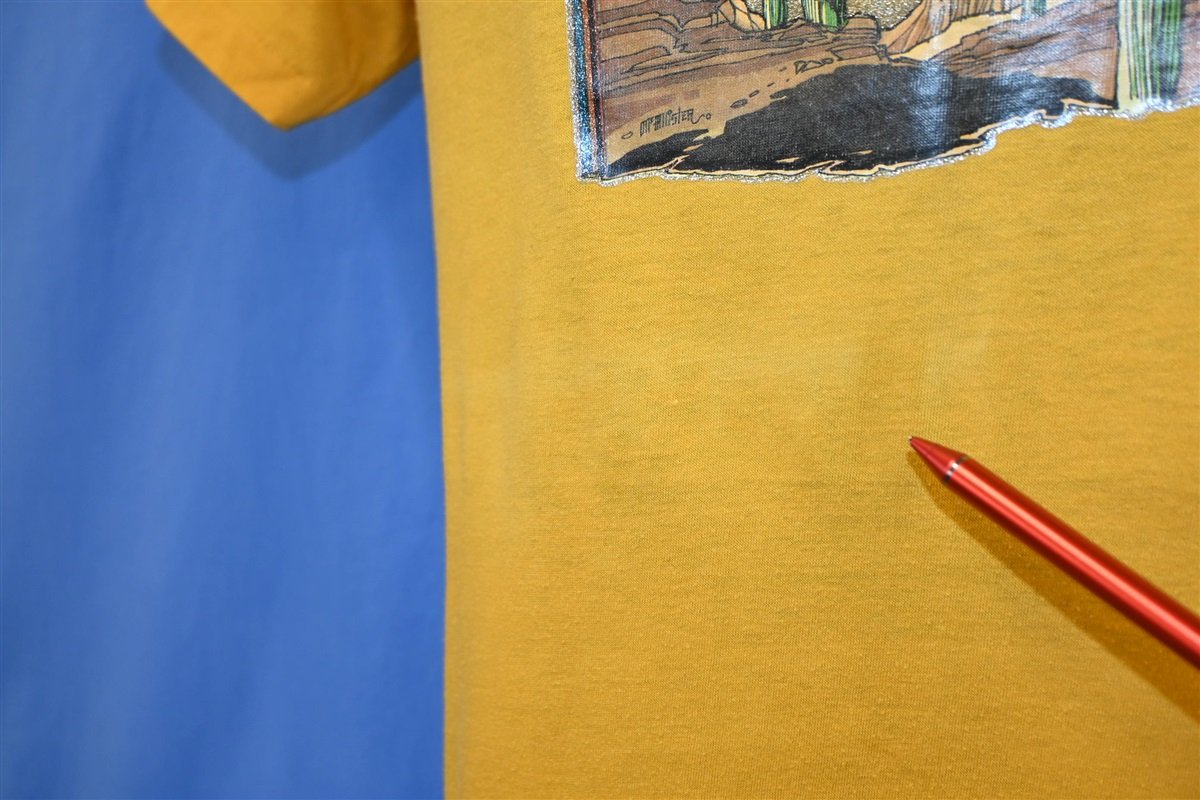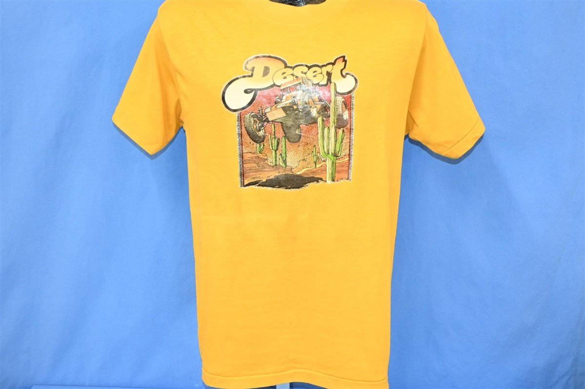 This vibrant vintage tee features a glittery iron on graphic of a dune buggy cruising through the desert. The dune buggy is shown surrounded by saguaro cactus, suggesting that the graphic is meant to depict the Sonoran Desert in Arizona, where saguaros are most commonly found. Dune buggies are a beloved recreational, off-road vehicle that are specifically designed to navigate the sand dunes of deserts and beaches. Most of them are built by modifying existing vehicles, with the most popular base choice being the punch buggy.