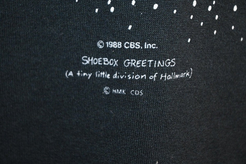 This funny vintage shirt features a spoof of the title card for the beloved science fiction anthology series, The Twilight Zone. The shirt pokes fun at getting older, and it reads "I'm 30 and entering the Twilight Years Zone". The twilight years refer to the last years of a person's life, and they usually occur much later than 30 years old. The graphic is copyright to Shoebox Greetings, a brand which belongs to Hallmark Cards and specializes in humorous greeting cards and party supplies. This shirt was likely intended to be a comical gift for someone nervous about no longer being in their 20s.