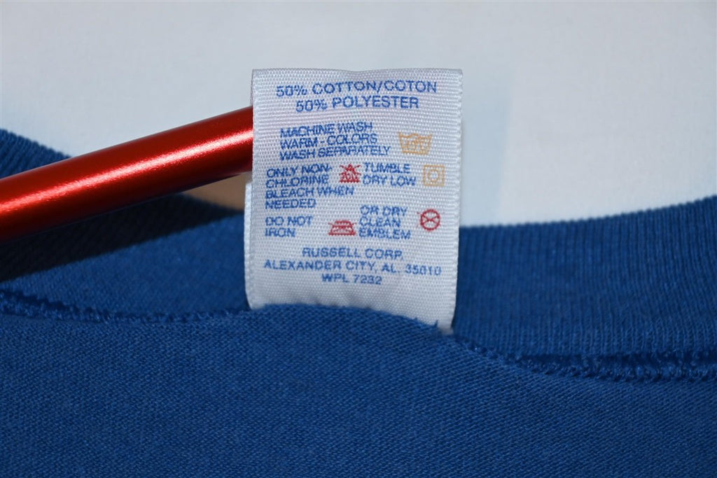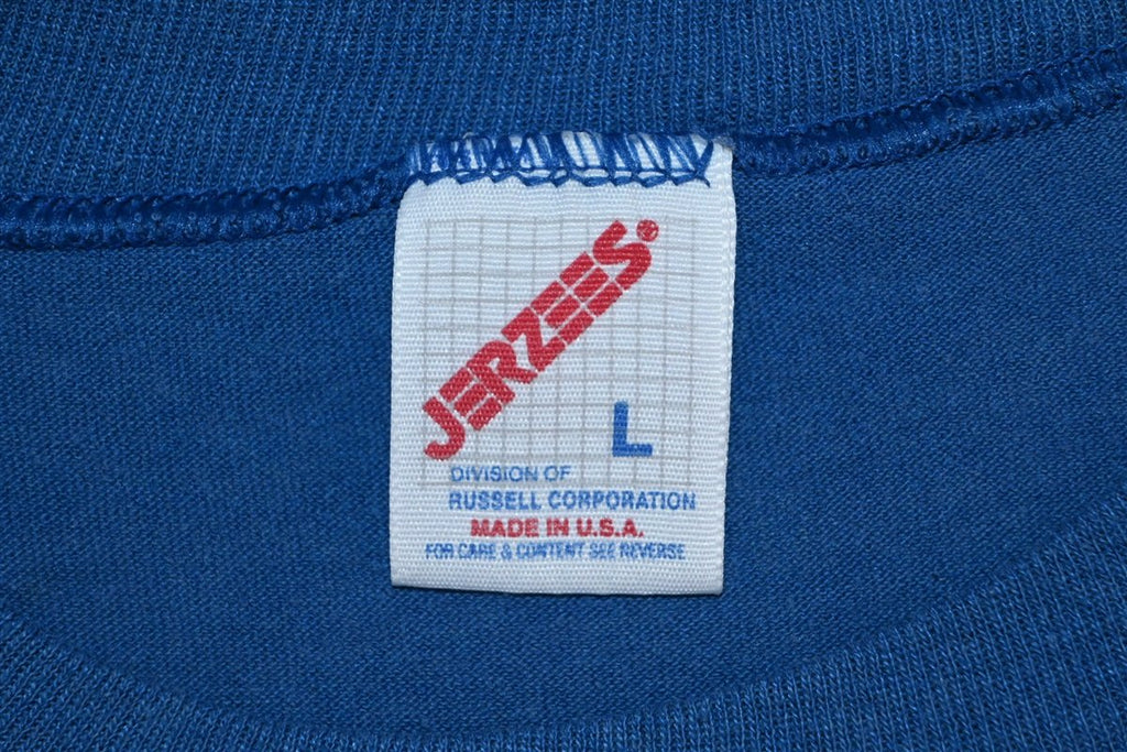 This cool tee features a graphic of children and the outline of the United States, filled in with the stars and stripes, that reads, "John M. Bailey Children Salute America - 1996." John M. Bailey is most likely in reference to an elementary school in Bayonne, New Jersey. The graphic is signed by artists Renee Rivera and Dana Smerda, who may have been students at John M. Bailey School in 1996.