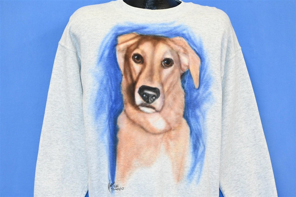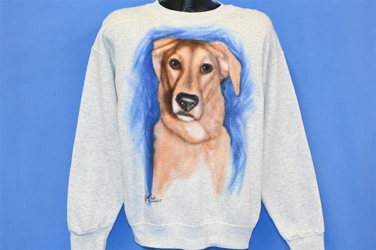 This delightful vintage sweatshirt has been specially customized with an airbrushed pet portrait. This sweatshirt was made in the 90s, when airbrush t-shirt stands were the perfect option for getting colorful custom-made apparel. The dog on this shirt looks to be either a golden retriever or labrador retriever. While the two breeds are both known for being affectionate family dogs, yellow labs tend to be better suited for more active owners.