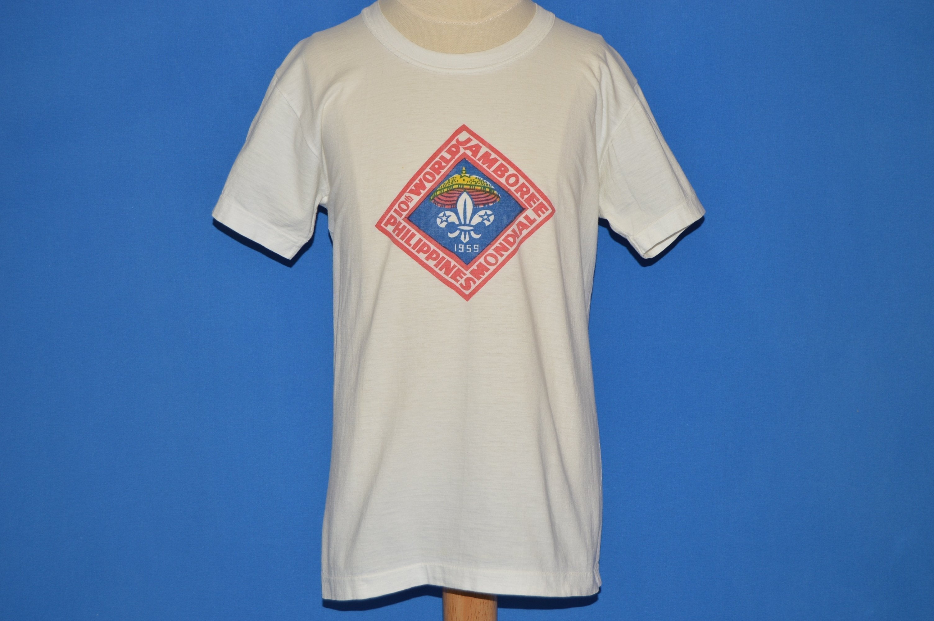 This white youth shirt has a graphic on the front that shows the Boy Scouts of America logo with the words "10th World Jamboree Mondial Philippines". Held in 1959, this was the first World Scouts Jamboree held outside the North America and Europe. It was called "The Bamboo Jamboree" due to the prevalence of bamboo and nipa palm in the area. Over 12,000 scouts attended. The World Scouts Jamborees is a large gathering of Scouts from all over the world. The first was held in 1920.