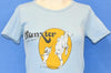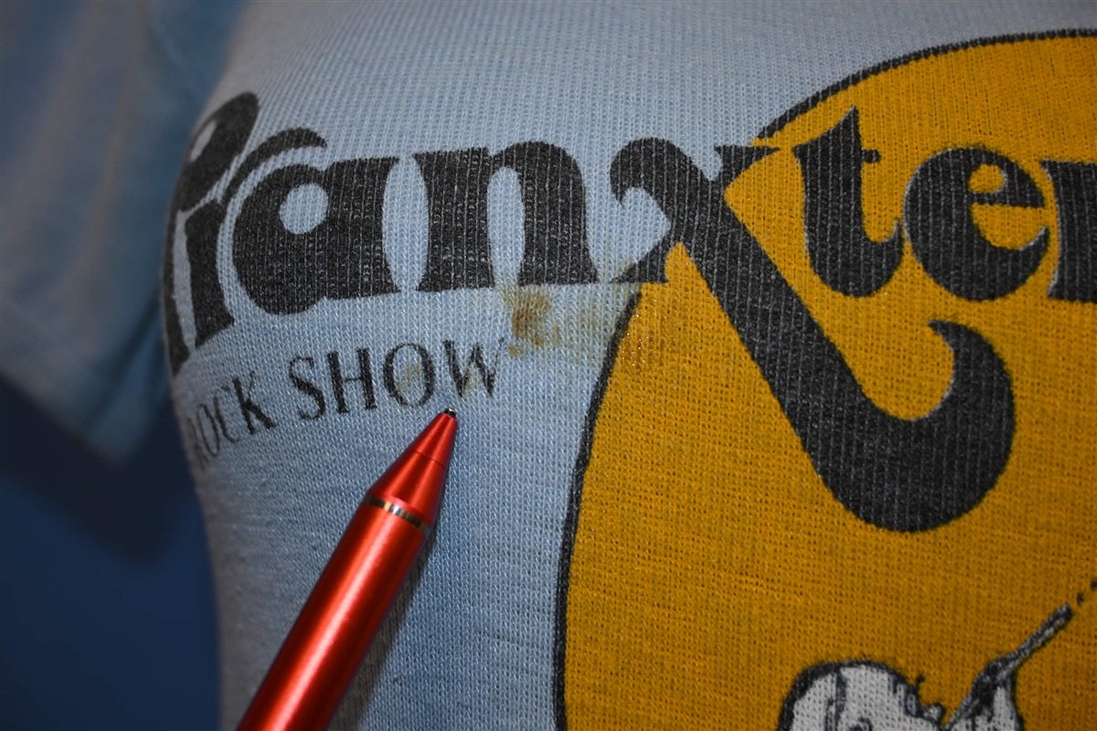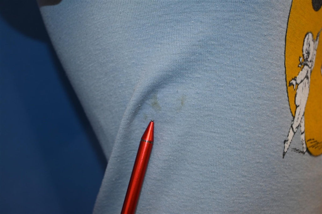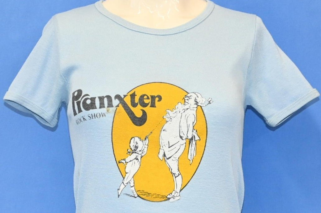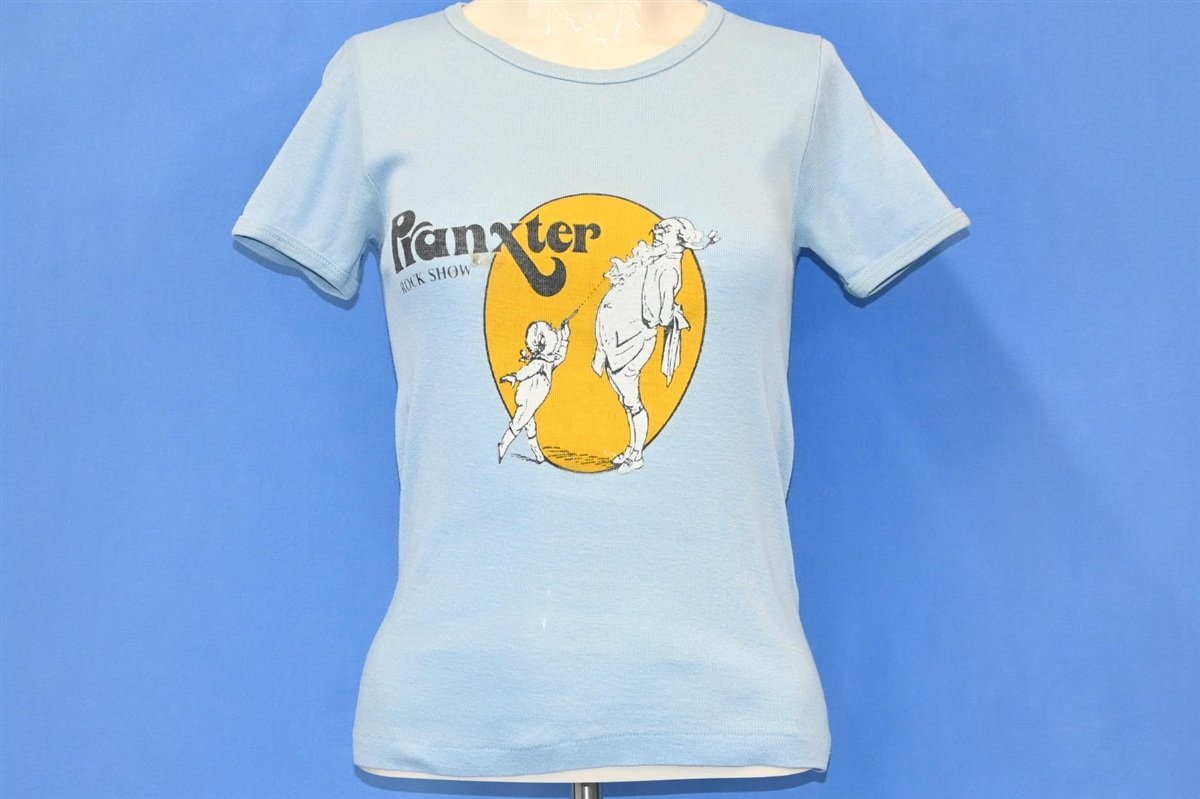 This sweet vintage tee features a cheeky illustration of a child shooting a spitball. The shirt bears the words, "Pranxter Rock Show", and was likely used to advertise a California-based band called Pranxter. This tee hails from the 70s, and there's records of a band named Pranxter playing throughout the Los Angeles area in the late 70s and into the 80s. Old newspaper articles show that the band used to play venues like the Starwood and the Troubadour nightclubs in West Hollywood. Another article also mentions the group placed second during a battle of the bands competition at the Ice House in Pasadena.