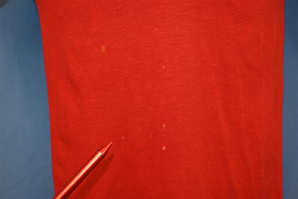 This vintage tee features a simple yet stylish design that makes for the perfect, timeless look. This shirt was made by the brand Bantams in the 80s, and it comes totally blank without any graphics on the front or back. The shirt has a bold colorblocked design that includes a bright red body and short black sleeves.