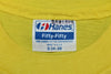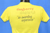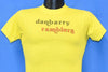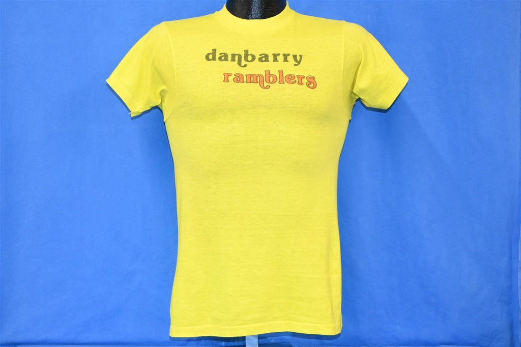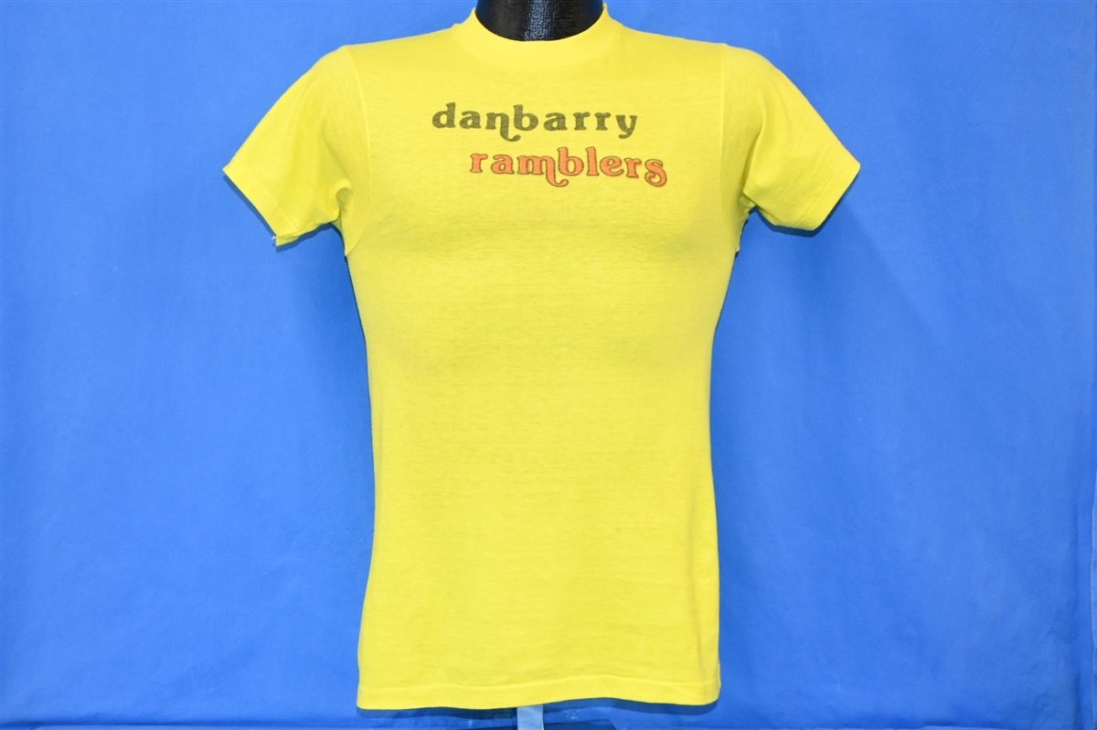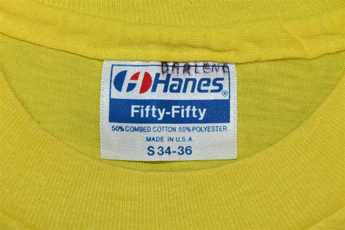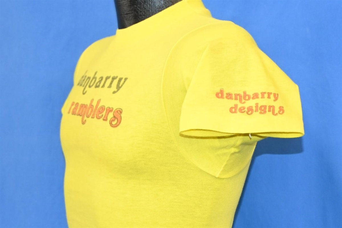 This bright yellow t-shirt was made by a trophy shop called Danbarry Designs. The shirt features the shop's logo on both the back and the sleeve as well as the clever slogan "an awarding experience". Danbarry Designs was a small business offering custom medals and trophies, and it was found situated along Aumoe Road in the town of Kailua, on the Hawaiian island of Oahu. The front of this tee reads, "Danbarry Ramblers" indicating that it was likely created for a local sports team that was sponsored by the shop.