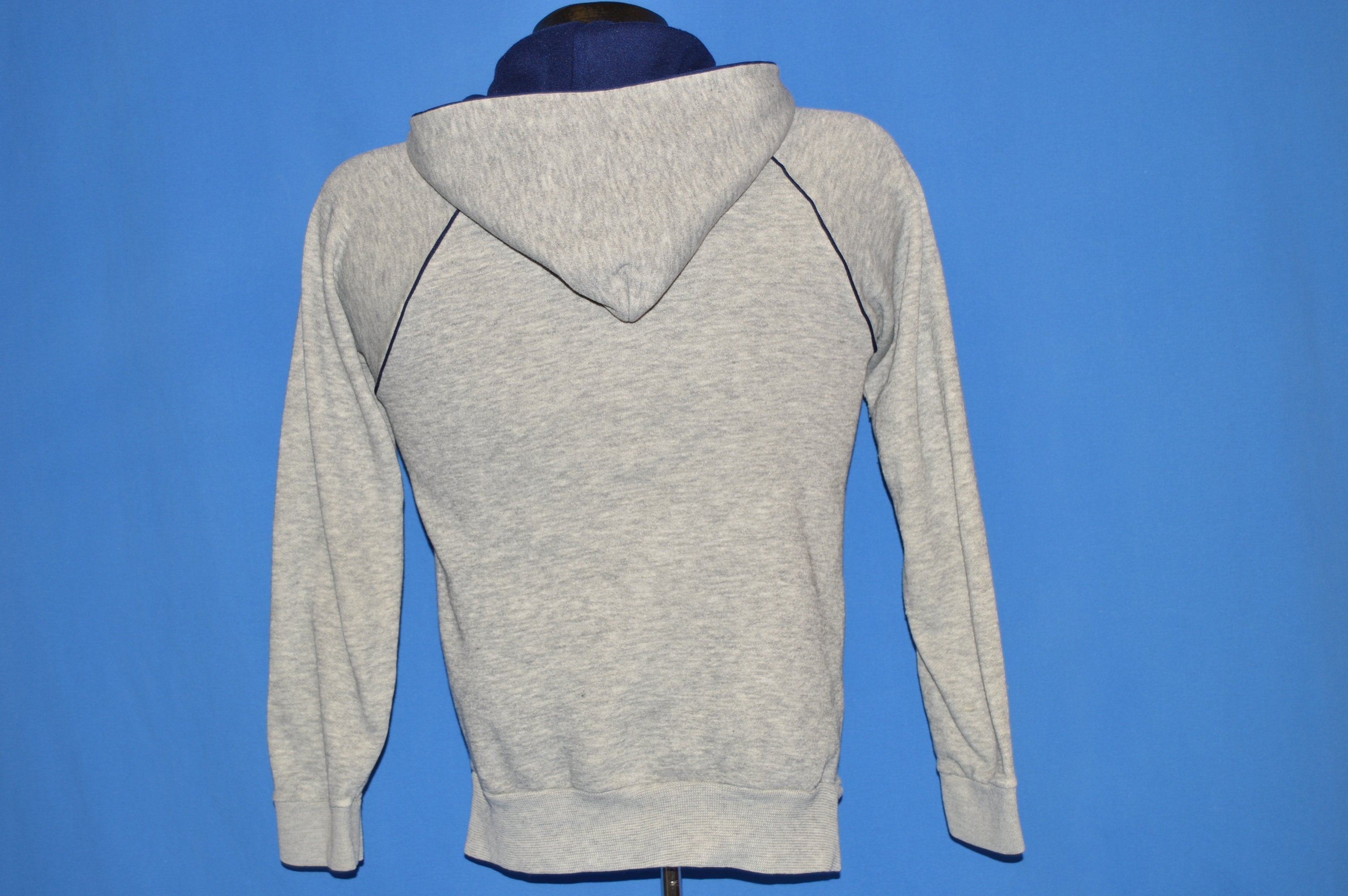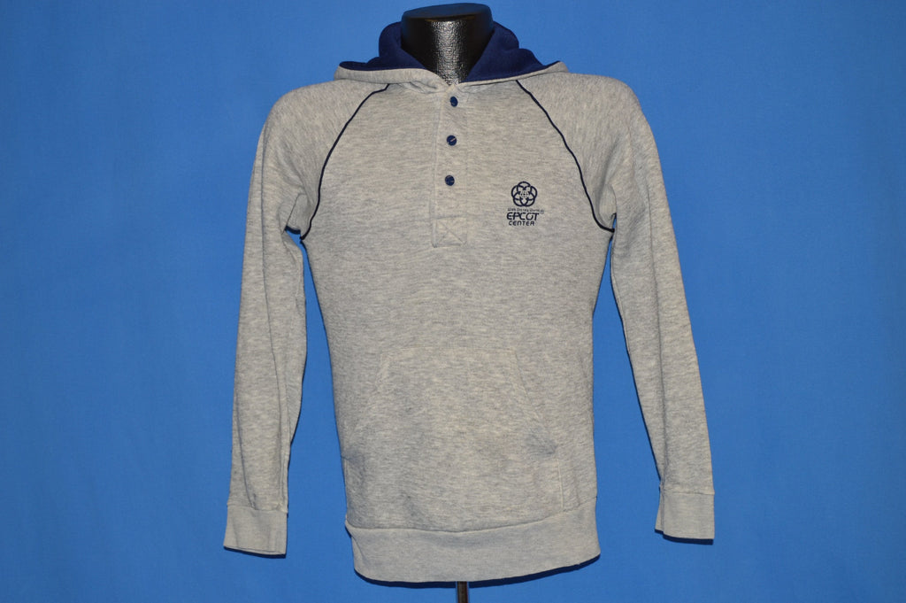 This hooded gray raglan sweatshirt has the Epcot Center logo on the front upper left. The sweatshirt has button closures on the front, and a pocket on the bottom front. The Epcot Center is a theme park within Walt Disney World. It is themed around world travels, and Epcot visitors can experience food and other cultural staples from countries such as Japan, Germany, and England.