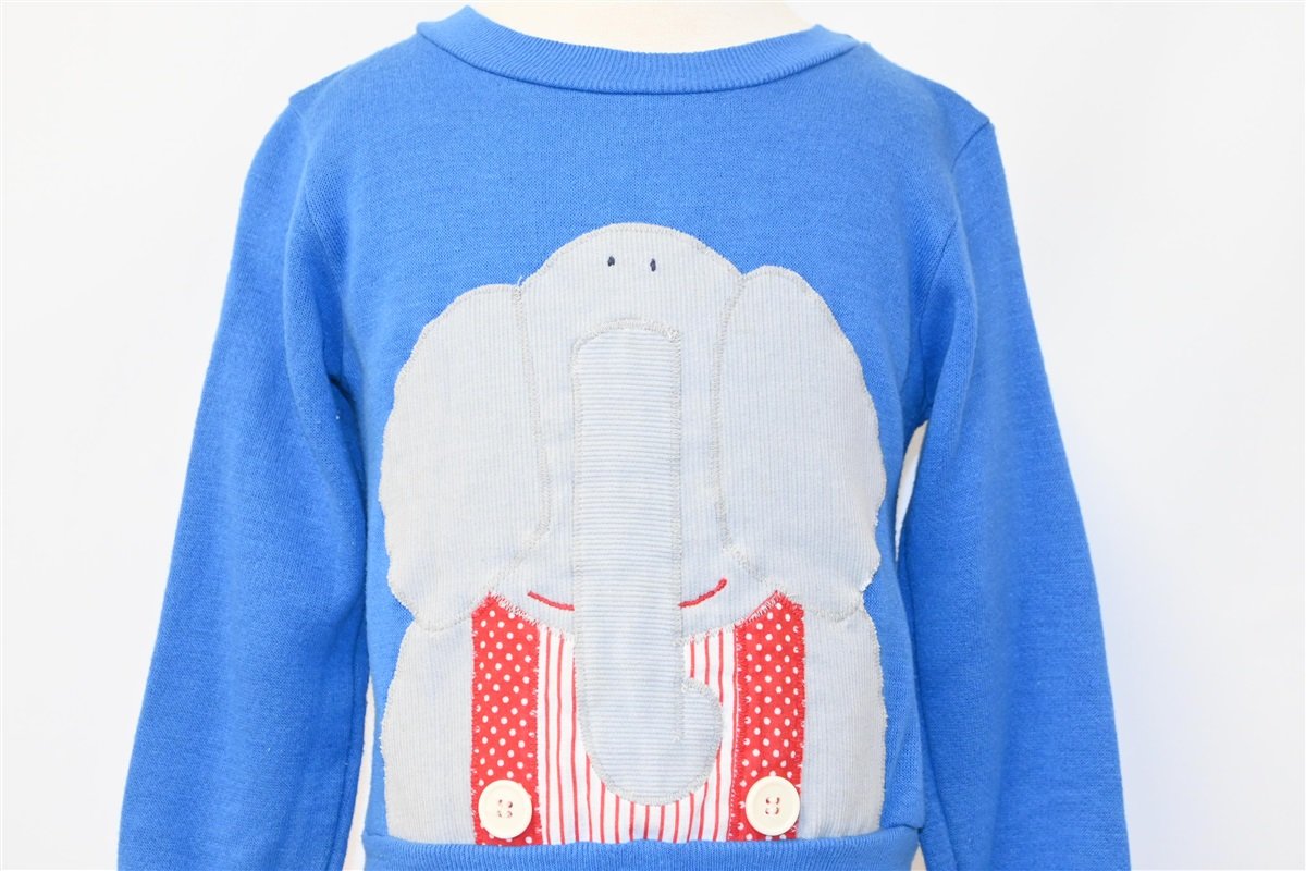 This adorable children's sweatshirt was made in the 80s and it features a graphic of an elephant. This sweatshirt is great for young kids, as the graphic includes corduroy fabric and two buttons, which gives the shirt a fun and unique textured element.
