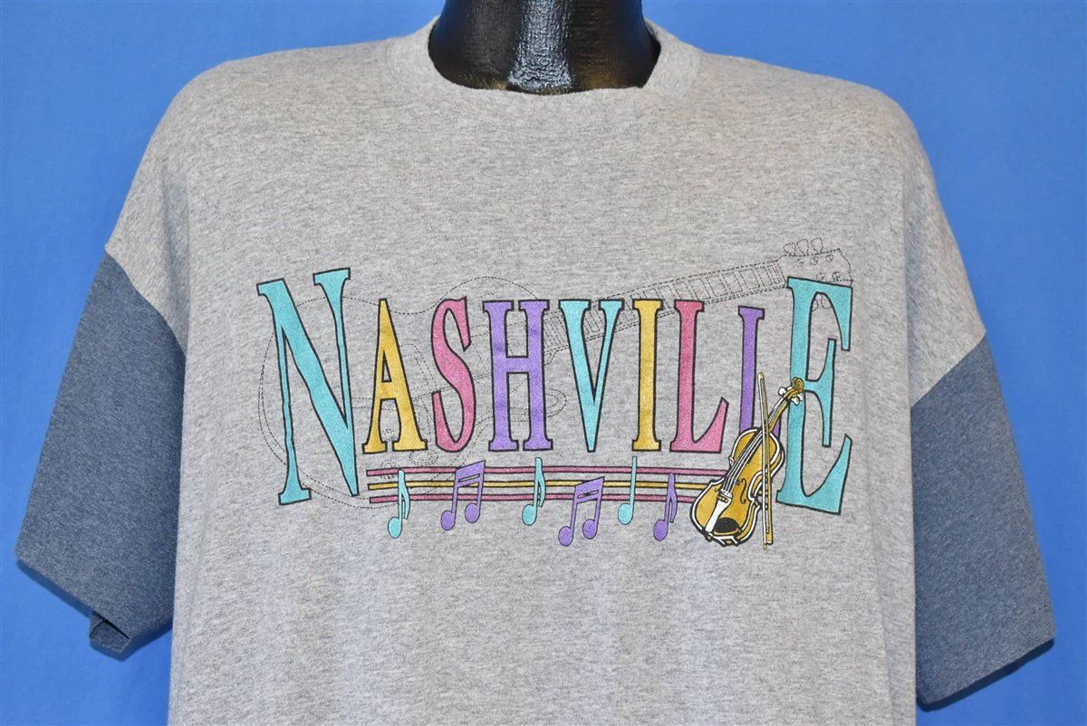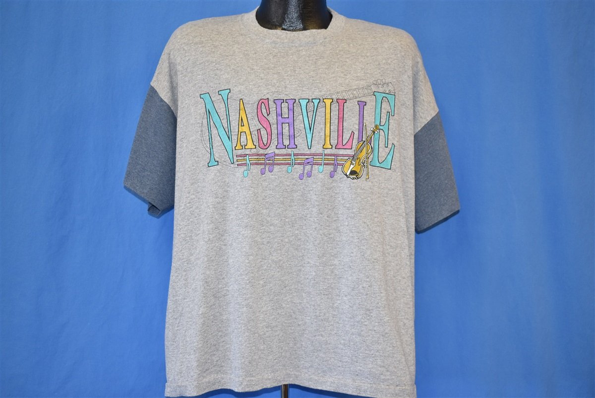 This classic tourist tee pays tribute to Nashville, Tennessee circa 1990s. It's held up great over the years and perfectly captures that old school nineties vibe with colorblock sleeves, soft poly cotton, and a cool oversized fit.