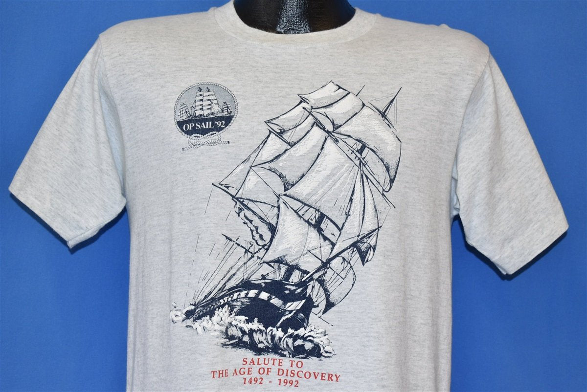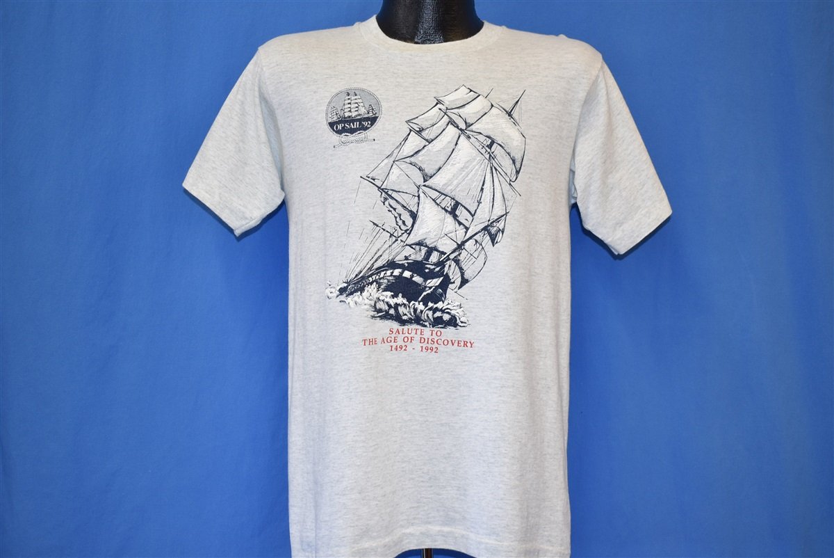 This cool vitnage tee is from Operation Sail in 1992, and it features a graphic of a majestic tall ship cruising through the water. Operation Sail is a series of sailing events conducted to celebrate significant sailing vessels and special occasions around the world. This shirt is from 1992, and it features the phrase "A Salute to the Age of Dsicovery". 1992 marked the 500th Anniversary of Christopher Columbus sailing to America and the event was marked by a sailing event designed to retrace Columbus's original venture.