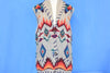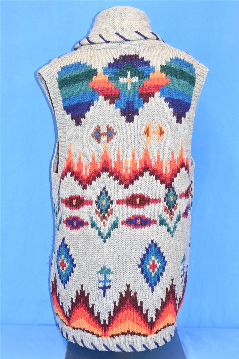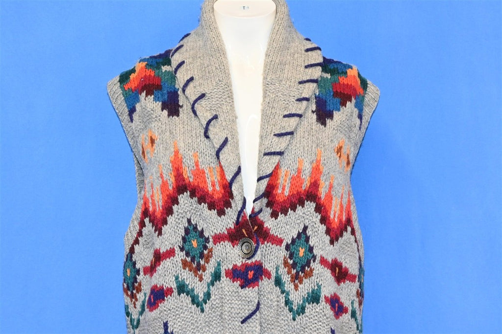This stunning women's vest was made by Woolrich sometime in the 1990s. It features an intricate intarsia pattern throughout that invokes images of flowers and flames. The shawl neck, pockets, and bottom hem have dark blue yarn looping through as accents. The vest features detailed metal buttons on the front as well.