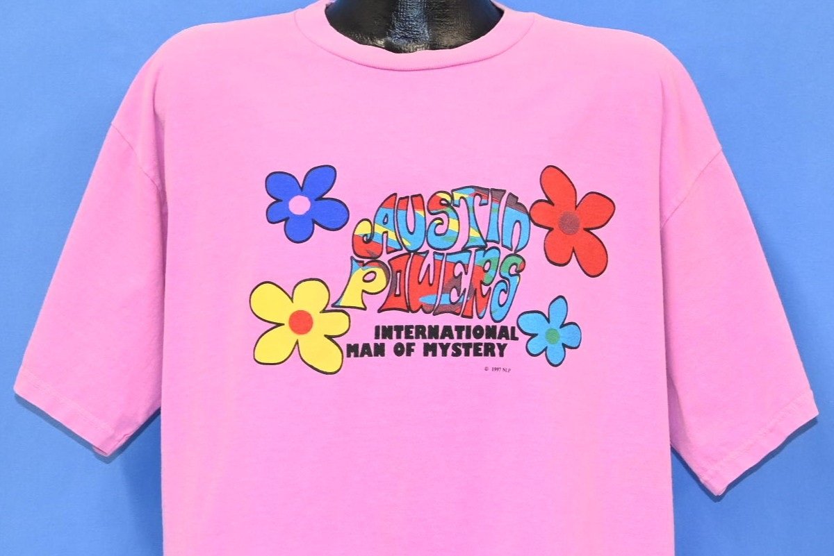This brightly colored tee promotes the first film in the hilarious Austin Powers trilogy, Austin Powers: International Man of Mystery. The back of the tee includes a tag line that reads, "Frozen in the 60s... thawing spring '97 baby!" Austin Powers was a comedic spoof of 60s pop culture and British spy films, that was written by and starred former Saturday Night Live cast member Mike Myers. Austin Powers was Myers' first project following the end of his run as an SNL regular, and the movie was a critical and commercial success that has since been lauded as one of the best comedies of the decade.